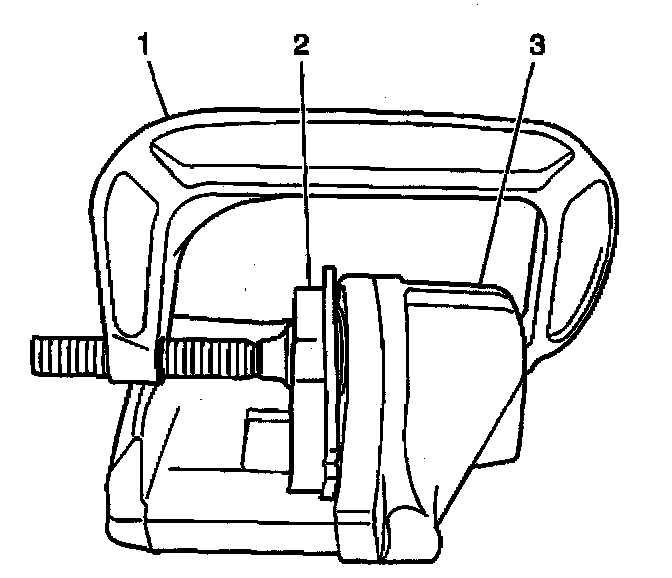 - For single piston caliper applications, insert a discarded inner brake pad (2) or block of wood in front of the piston. Using a large C-clamp (1) installed over the body of the caliper (3) and against the brake pad or block of wood, slowly bottom the piston in the bore.