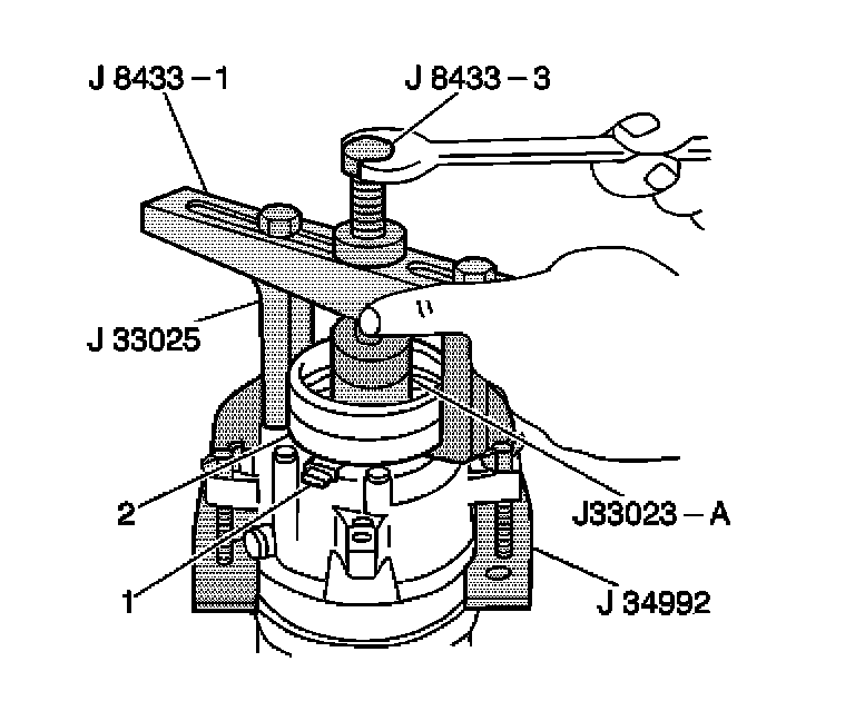 10. Tighten the J 8433-3 against the puller pilot in order to remove the clutch coil (2).