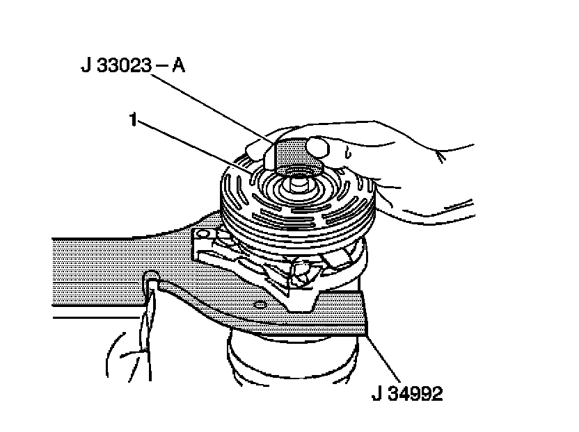11. With the compressor mounted to the J 34992, position the pulley rotor (1) and bearing assembly on the front head.