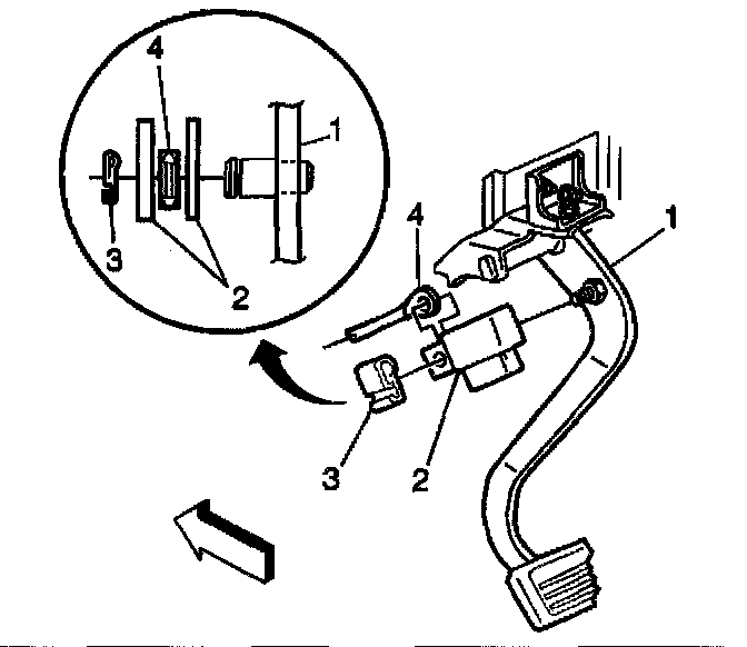 3. Unsnap the switch (2) and pushrod (4) from the brake pedal (1) pin.
