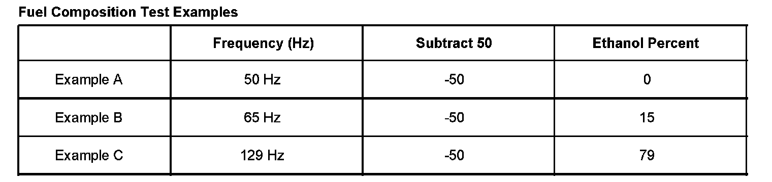 12. Subtract 50 from the reading on the DMM to obtain the percentage of alcohol in the fuel sample. Refer to the examples in the table.