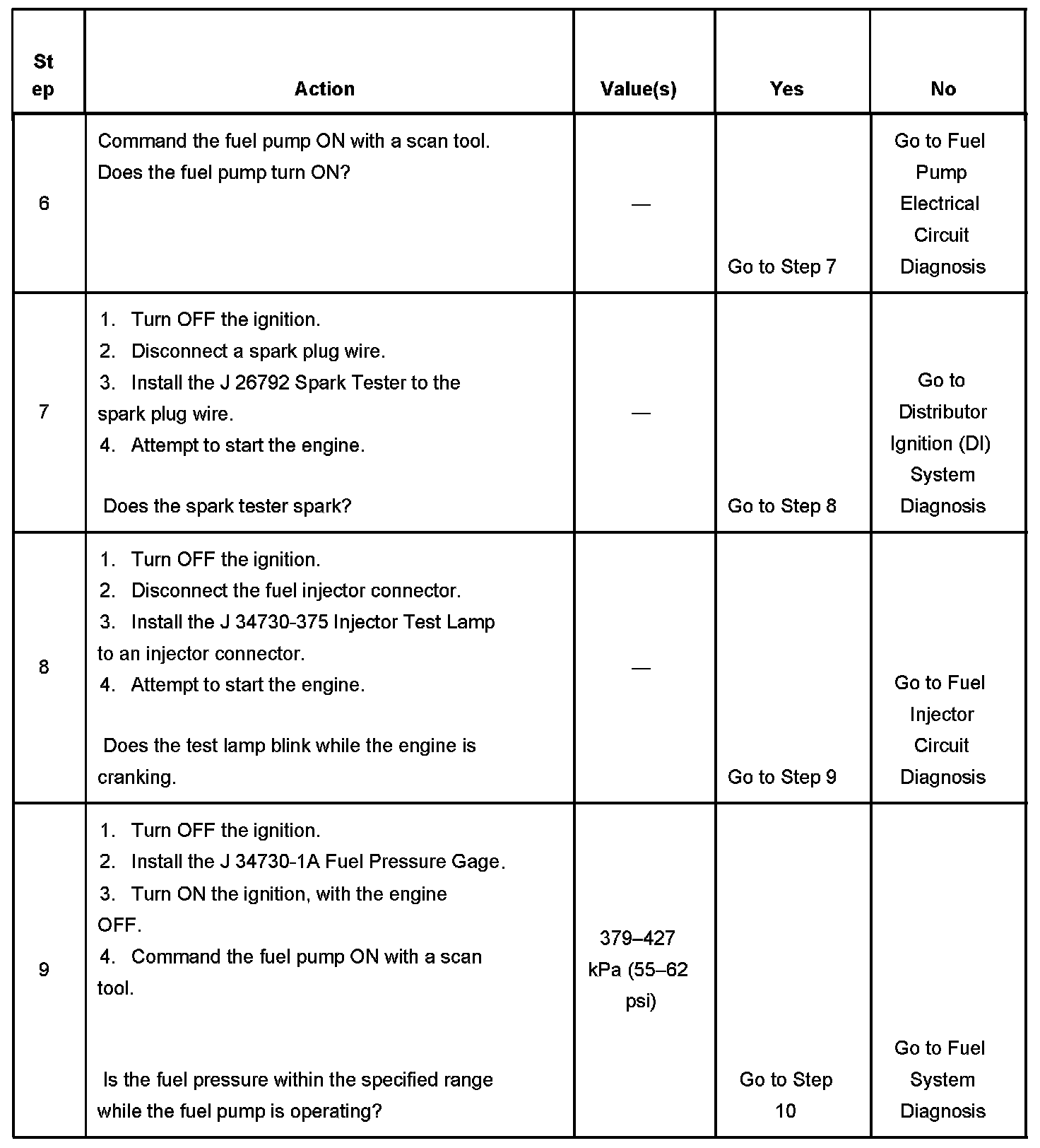 DESCRIPTIONThe Engine Cranks but Does Not Run diagnostic table is an organized approach to identifying a condition that prevents an engine from starting. The Engine Cranks but Does Not Run diagnostic table directs the service technician to the appropriate system diagnosis.