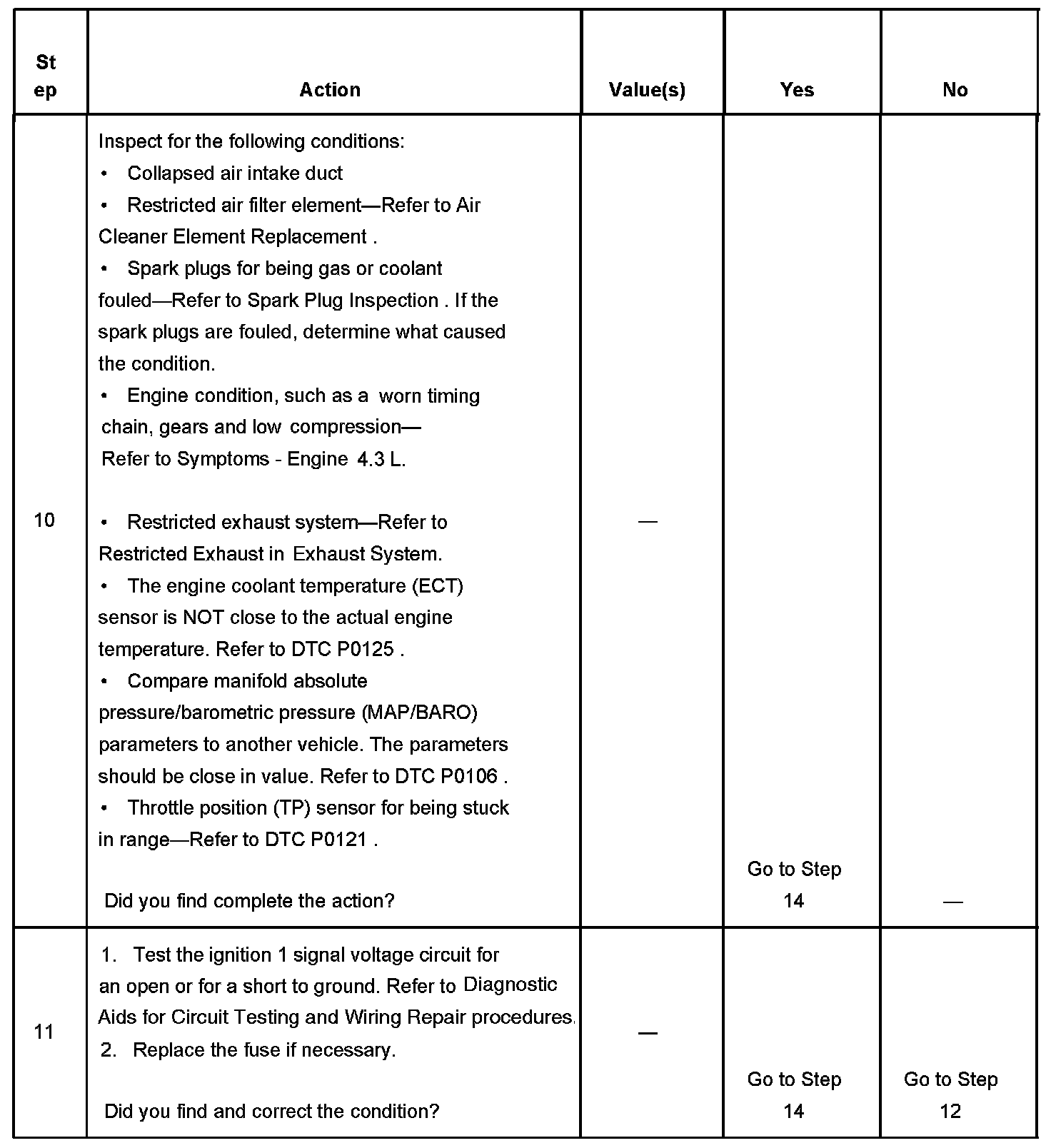 The Engine Cranks but Does Not Run diagnostic table assumes the following: