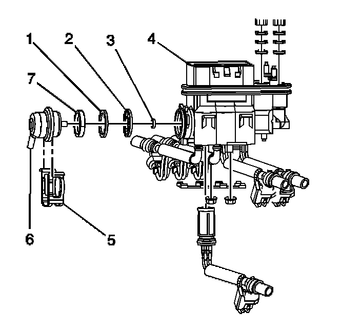 4. Pull and twist the fuel pressure regulator (6) in order to remove the fuel pressure regulator from the fuel pressure regulator housing using a shop towel to catch any spilled fuel.