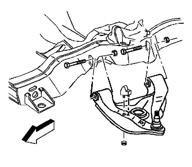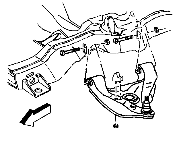 6. Remove the lower control arm bolts and the nuts. Remove the rear bolt and the rear nut first.