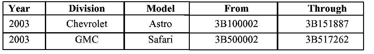 Involved are certain 2003 model year Chevrolet Astro and GMC Safari vehicles equipped with rear-wheel drive, and built within the VIN breakpoints shown.