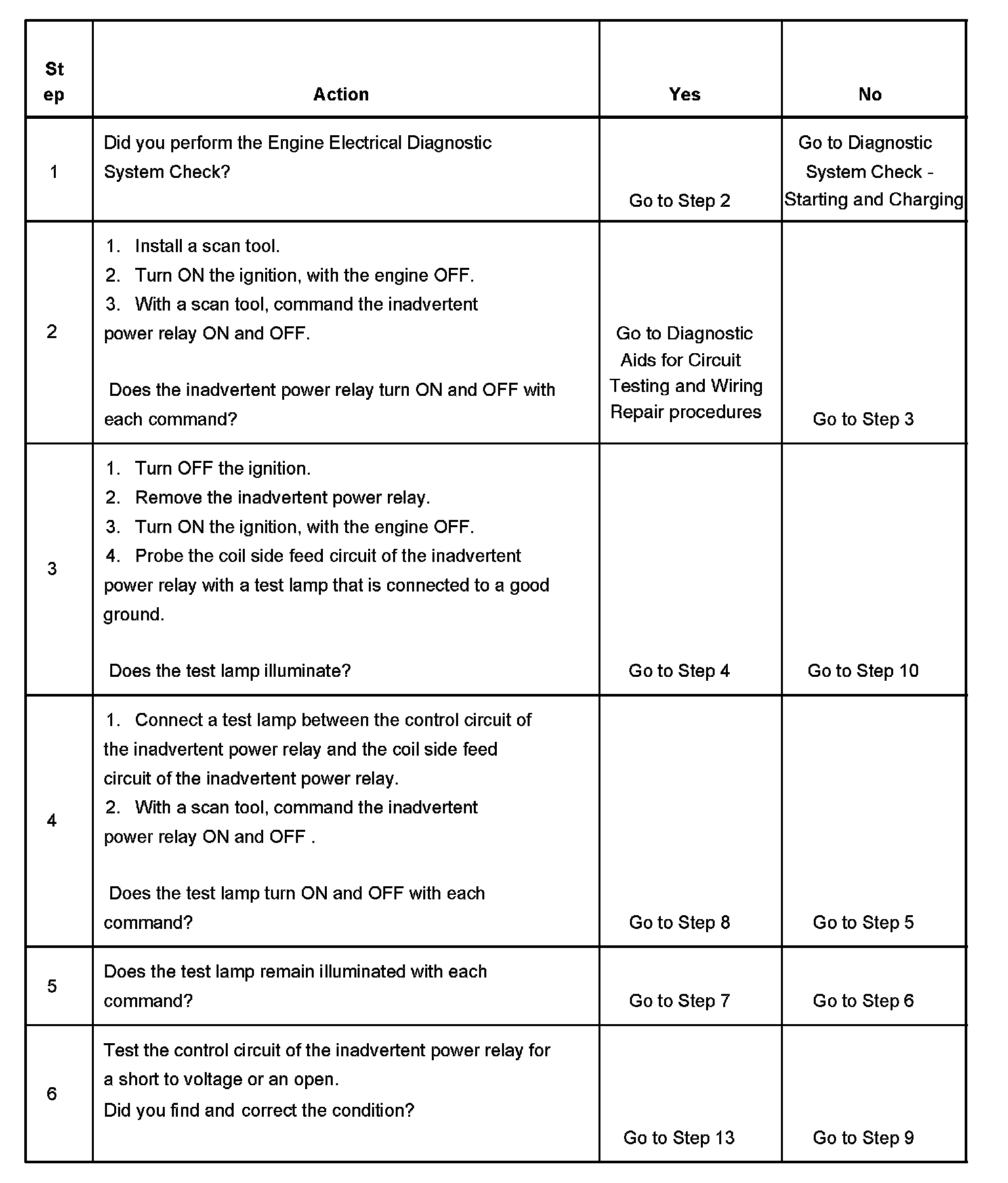 The numbers below refer to the step numbers on the diagnostic table.