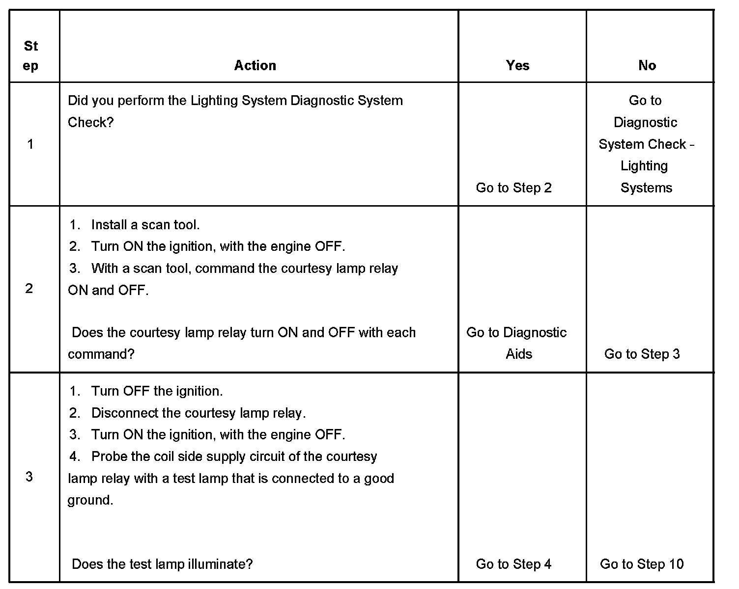 2. Listen for an audible click when the courtesy lamp relay operates. Command both the ON and OFF states. Repeat the commands as necessary.
