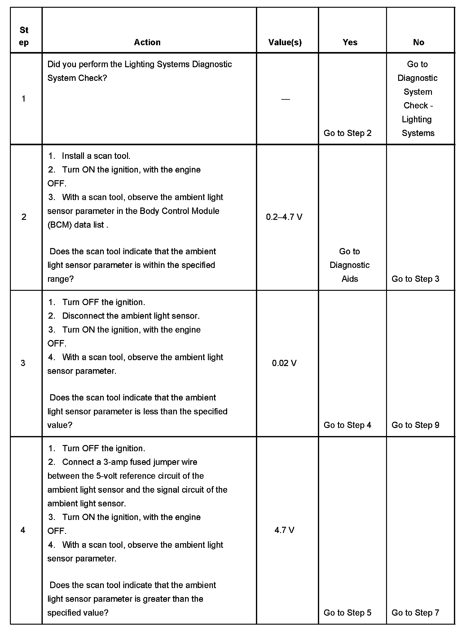 The body control module (BCM) monitors the courtesy lamp relay coil control circuit in order to determine if the daytime running lights (DRL) or the auto headlights (ALC) should be turned ON in the AUTO mode. When the BCM senses the ambient light sensor voltage is between 1.7 volts and 4.7 volts, the DRL will be commanded ON. When the BCM senses the ambient light sensor voltage is between 0.2 volts and 1.0 volts, the ALC will be commanded ON.