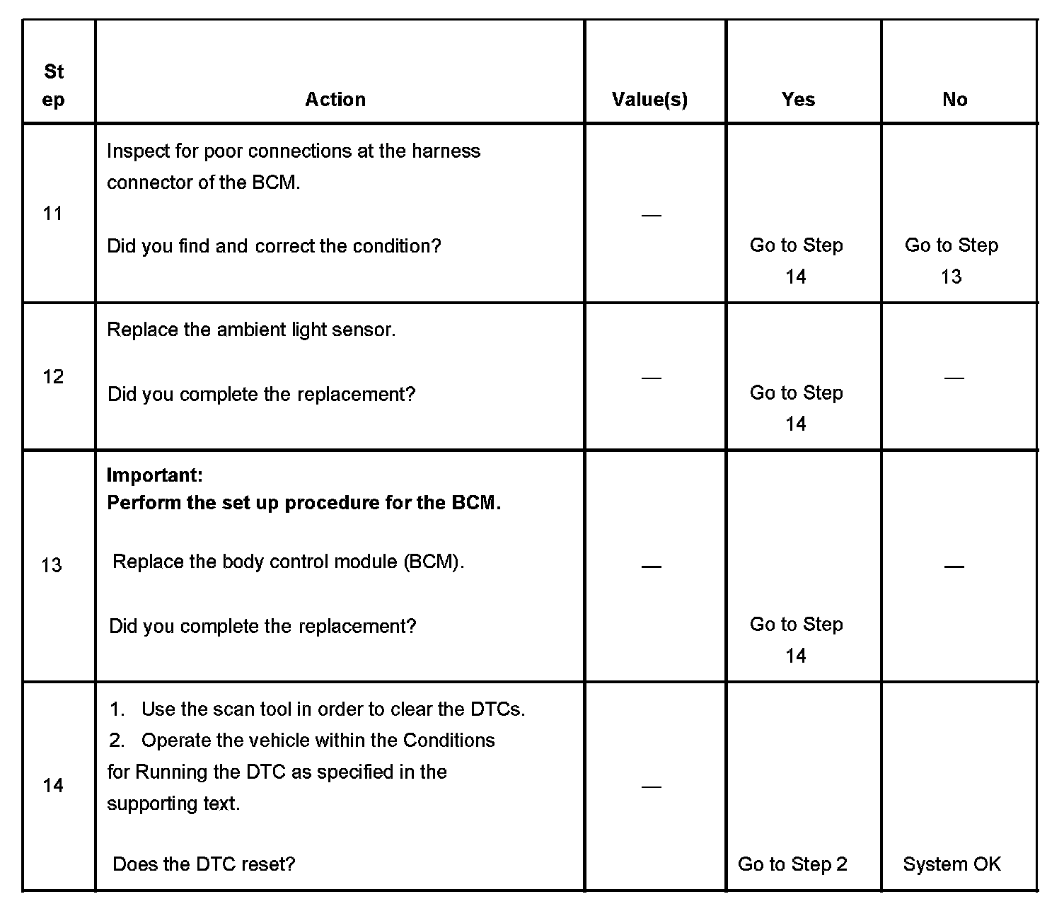The numbers below refer to the step numbers on the diagnostic table.