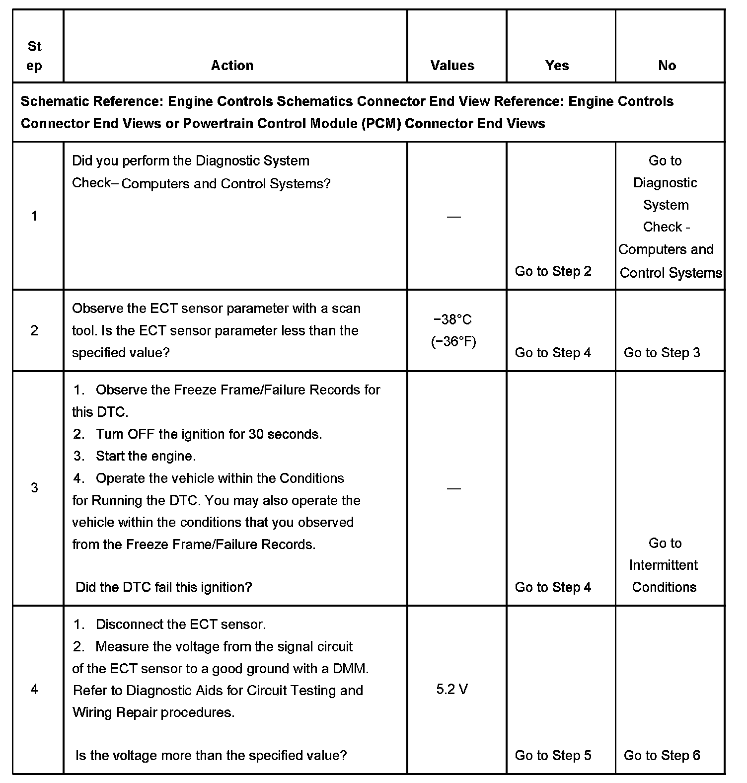 The PCM detects that the ECT sensor parameter is less than -38°C (-36°F) for 20 seconds.