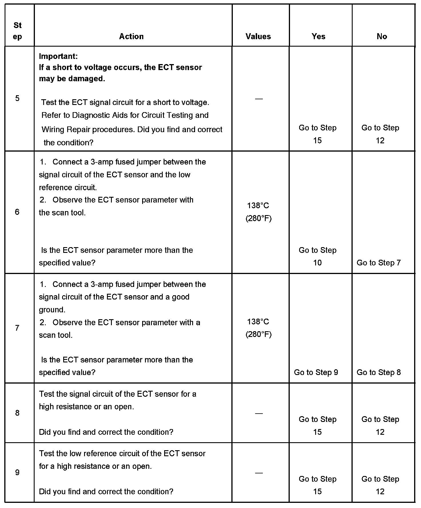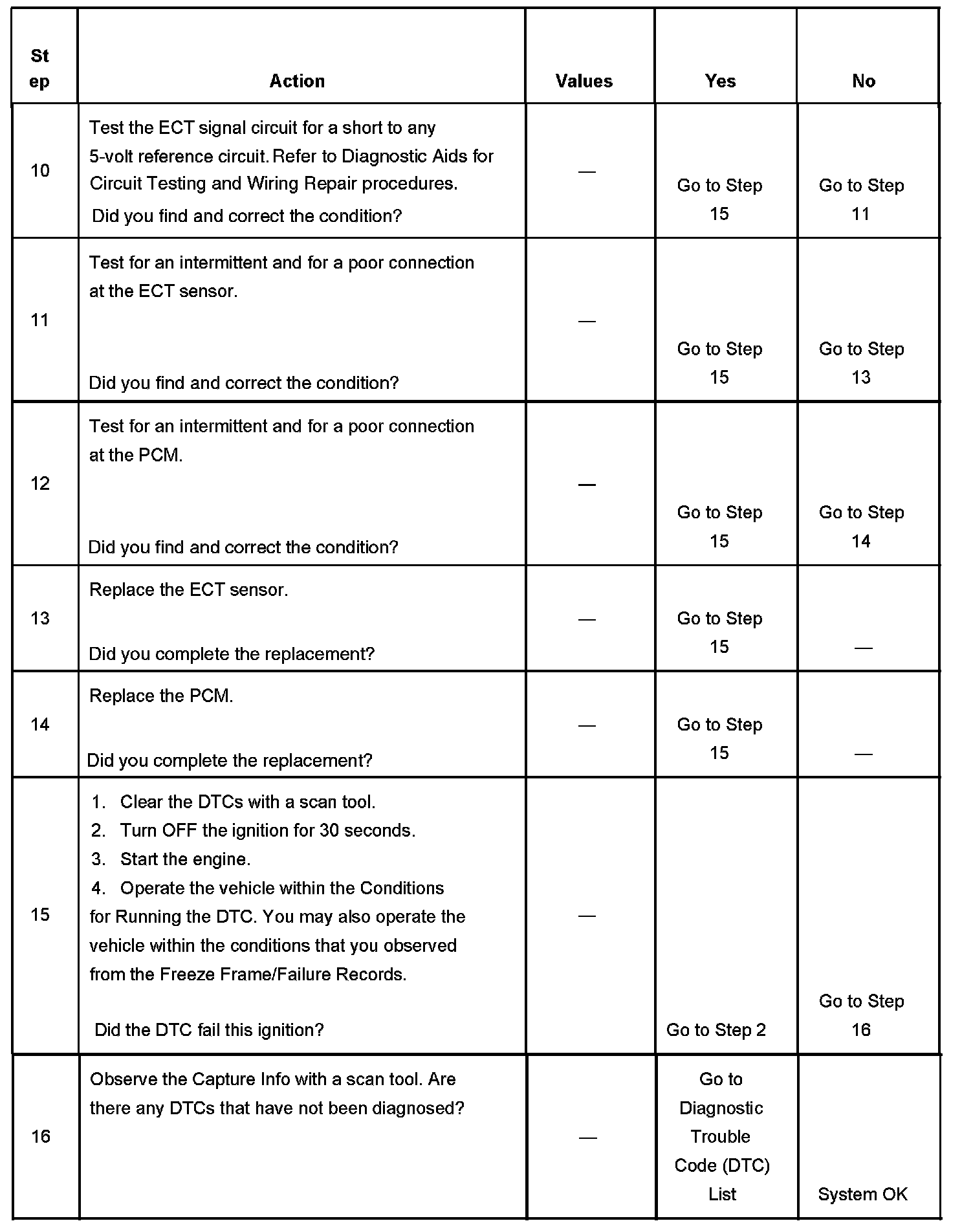 CIRCUIT DESCRIPTIONThe engine coolant temperature (ECT) sensor is a variable resistor, that measures the temperature of the engine coolant. The ECT sensor has a signal circuit and a low reference circuit. The powertrain control module (PCM) supplies 5 volts to the ECT signal circuit and a ground for the ECT low reference circuit. When the ECT is cold, the sensor resistance is high. When the ECT increases, the sensor resistance decreases. With high sensor resistance, the PCM detects a high voltage on the ECT signal circuit. With lower sensor resistance, the PCM detects a lower voltage on the ECT signal circuit. If the PCM detects an excessively high ECT signal voltage, which is a low temperature indication, DTC P0118 sets.