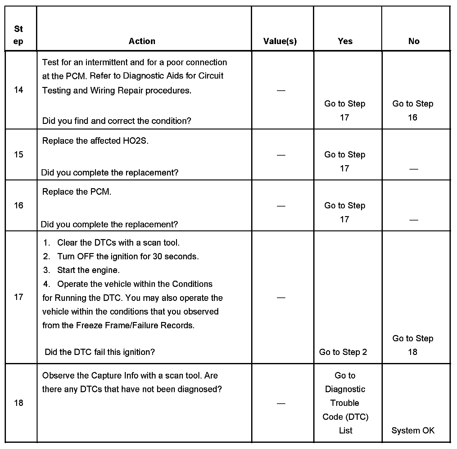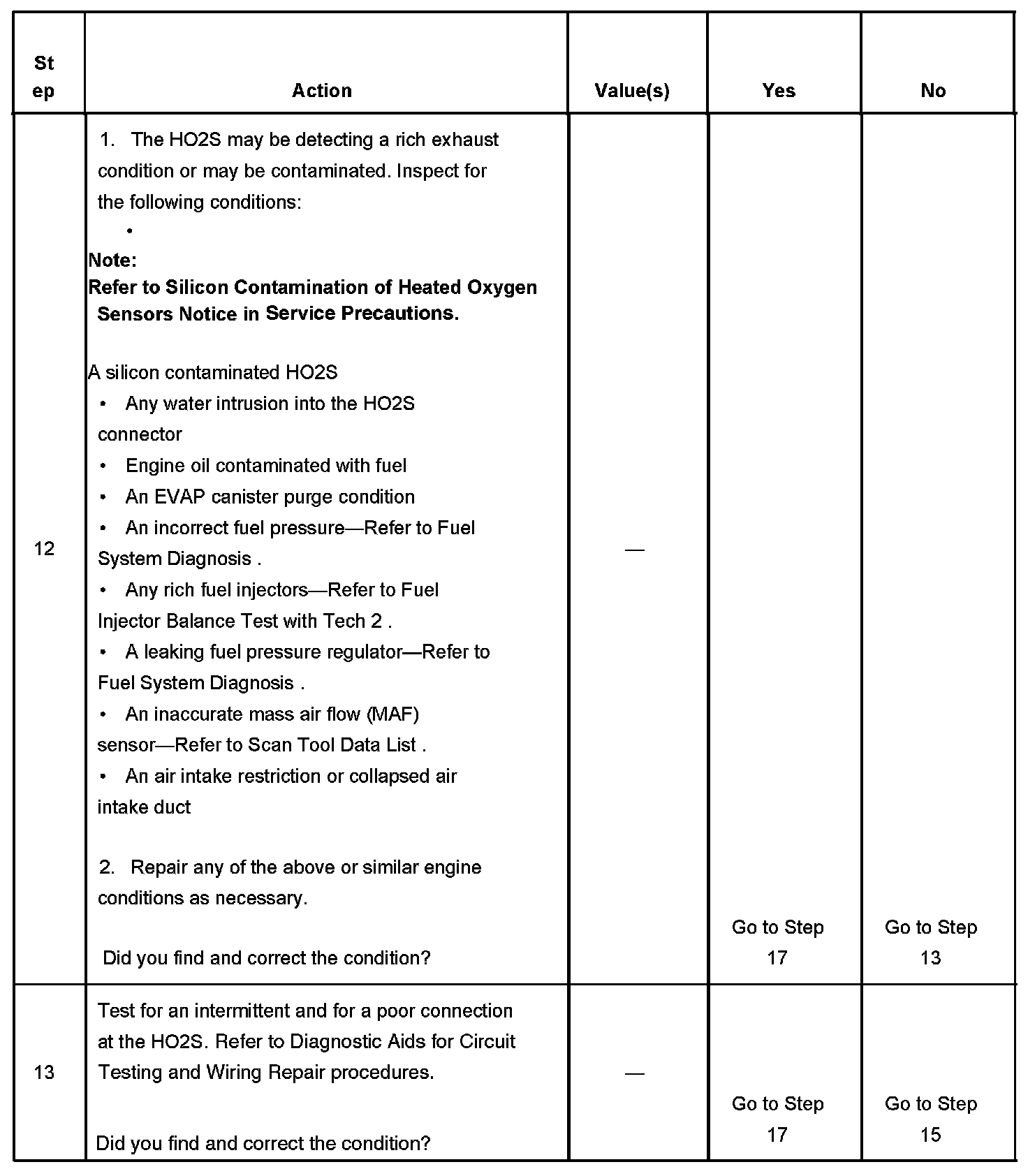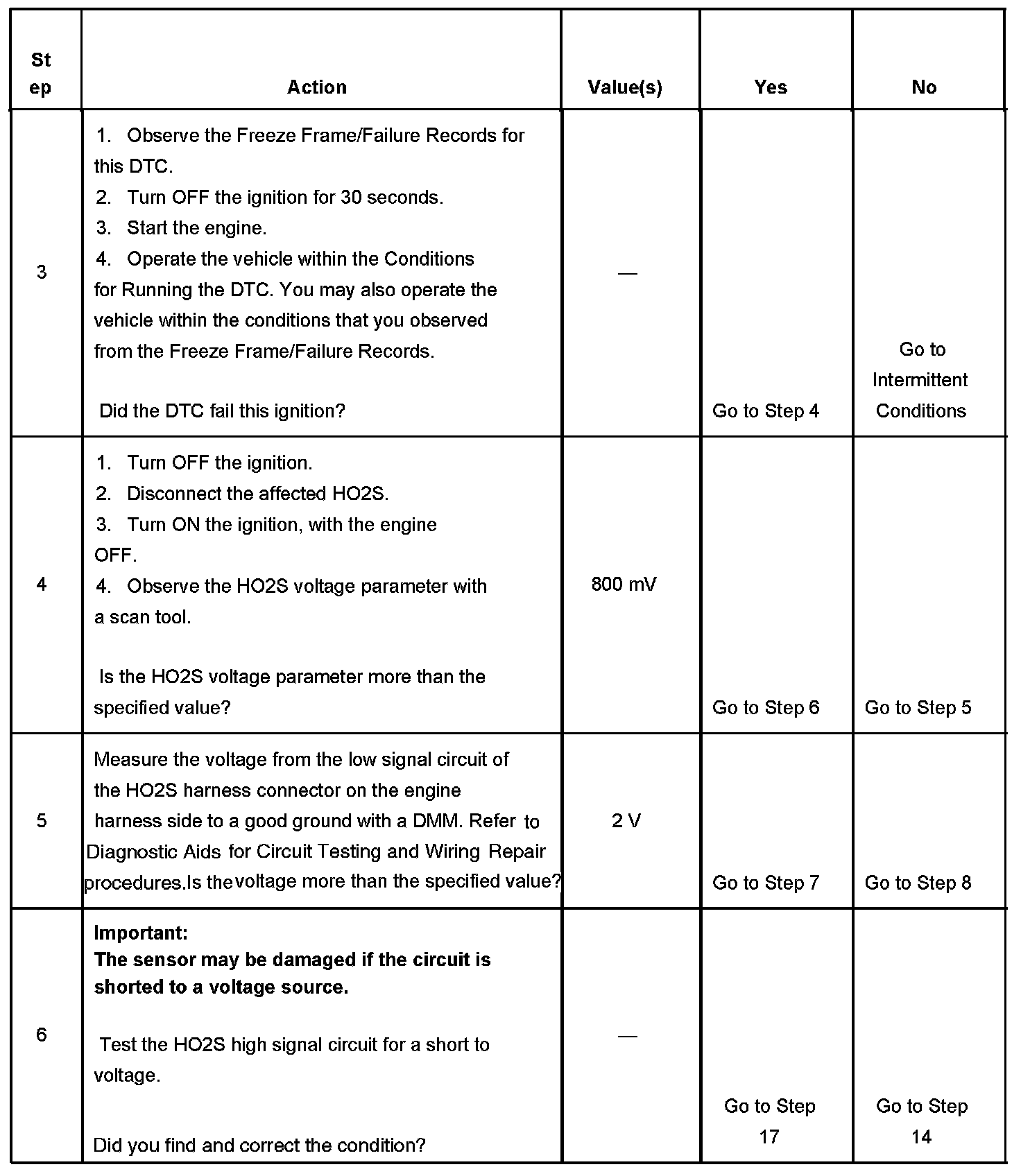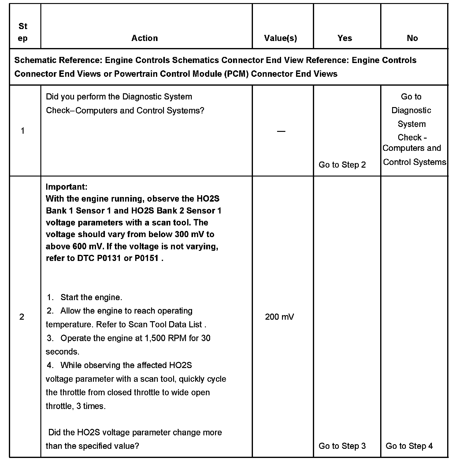 CIRCUIT DESCRIPTIONHeated oxygen sensors (HO2S) are used for fuel control and post catalyst monitoring. Each HO2S compares the oxygen content of the surrounding air with the oxygen content in the exhaust stream. The HO2S must reach operating temperature to provide an accurate voltage signal. Heating elements inside the HO2S minimize the time required for the sensors to reach operating temperature. The powertrain control module (PCM) supplies the HO2S with a reference, or bias, voltage of about 450 mV. When the engine is first started the PCM operates in open loop, ignoring the HO2S voltage signal. Once the HO2S reaches operating temperature and closed loop is achieved, the HO2S generates a voltage within a range of 0-1,000 mV that fluctuates above and below bias voltage. High HO2S voltage indicates a rich exhaust stream; low HO2S voltage indicates a lean exhaust stream. If the PCM detects an HO2S voltage that stays above a specified value, DTC P0138 will set.