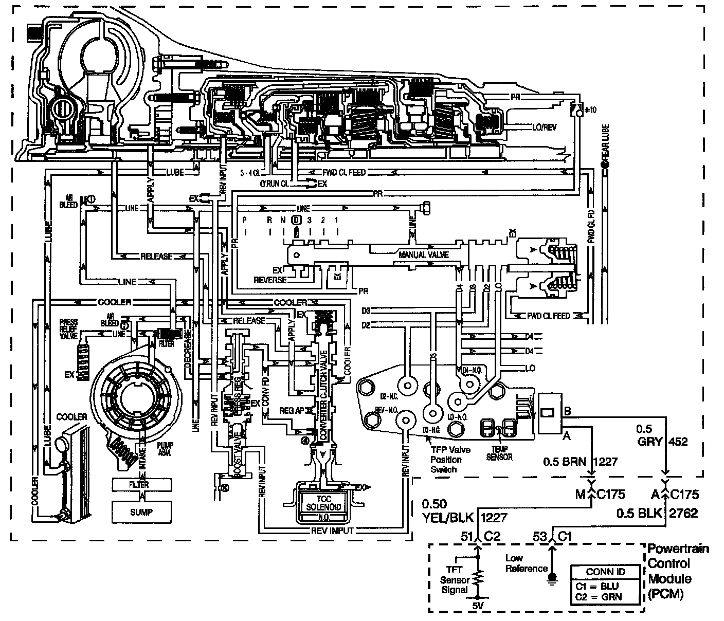 The flow of transmission fluid starts in the bottom pan and is drawn through the filter, control valve body assembly, transmission case and into the oil pump assembly. The oil pump assembly pressurizes the fluid and directs it to the pressure regulator valve where it becomes the main supply of fluid to the various components and hydraulic circuits in the transmission. Hot fluid exiting the torque converter flows through the converter clutch apply valve and into the transmission cooler lines to the oil cooler located in the vehicle radiator, and auxiliary cooler if equipped. From the cooler, fluid returns to cool and lubricate the front of the transmission. In forward drive ranges, D4 fluid from the manual valve is routed through an orificed cup plug in the rear of the transmission case to feed the rear lube fluid circuit.