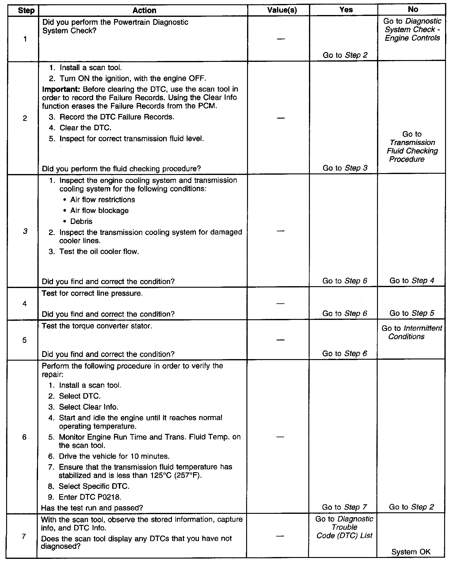 When the Powertrain Control Module (PCM) detects a high Transmission Fluid Temperature (TFT) for a long period of time, then DTC P0218 sets. DTC P0218 is a type C DTC.