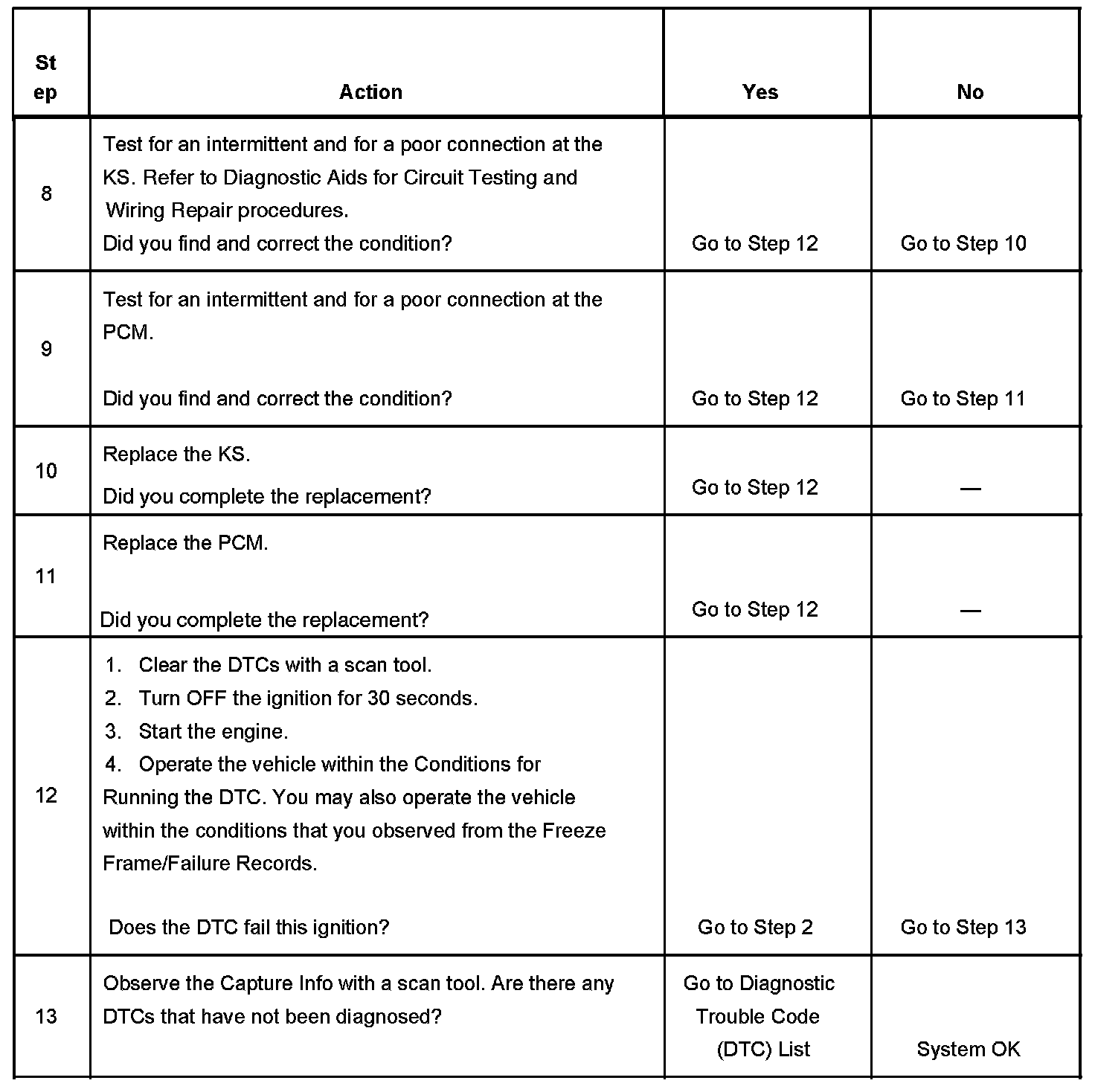 CIRCUIT DESCRIPTIONThe powertrain control module (PCM) monitors a knock sensor (KS) in order to determine if detonation is present. The KS produces an AC voltage at all engine speeds and loads. The powertrain control module (PCM) then adjusts the spark timing based on the amplitude and frequency of the KS signal. The PCM uses the KS signal to calculate the average voltage and then assigns a voltage range value. The PCM should monitor the KS signal within the assigned voltage range. This diagnostic trouble code (DTC) will set if the KS signal is outside the assigned voltage range or the KS signal is not present.