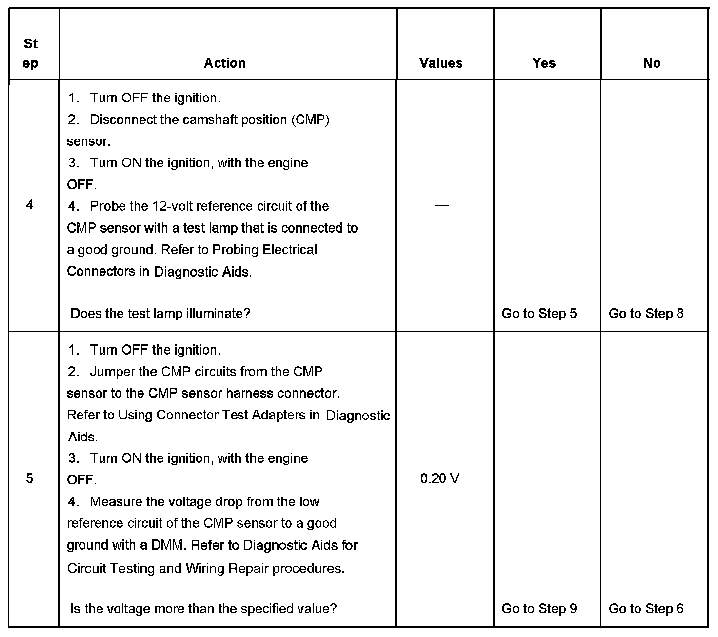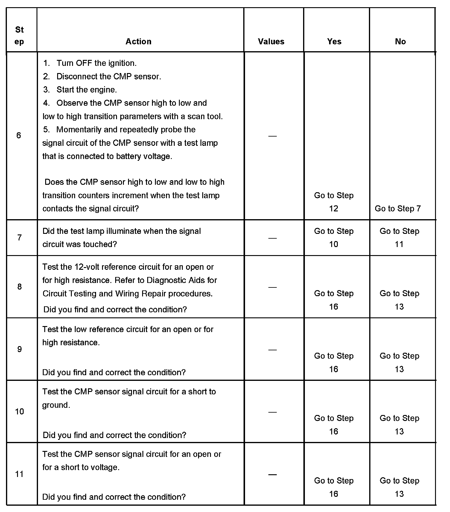 6. This step tests the CMP sensor signal circuit. Applying a voltage causes the CMP sensor high to low and low to high parameter to increase if the circuit and the PCM are operating properly.