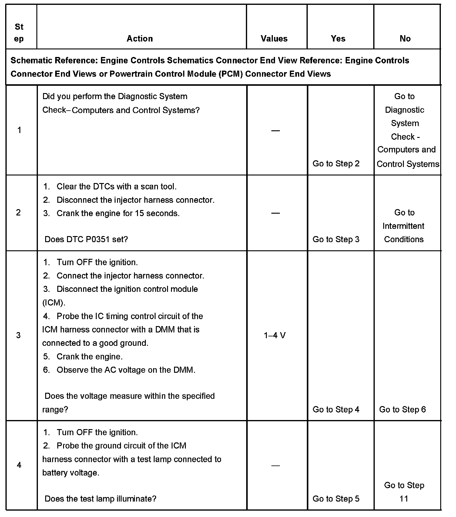 CIRCUIT DESCRIPTIONThe enhanced ignition system uses the crankshaft position (CKP) sensor to provide a timing input to the control module. Ignition control (IC) spark timing for each cylinder is based on this input. The control module provides the ignition timing signal to the ignition control module (ICM) to control the ignition coil. Each timing pulse detected by the ICM allows the ICM to energize the ignition coil. A large secondary ignition voltage is induced in the secondary coil winding by the primary coil winding. This high voltage is switched to the correct spark plug by the distributor. If the powertrain control module (PCM) detects an unusually high or low voltage on the ignition signal circuit, DTC P0351 sets.