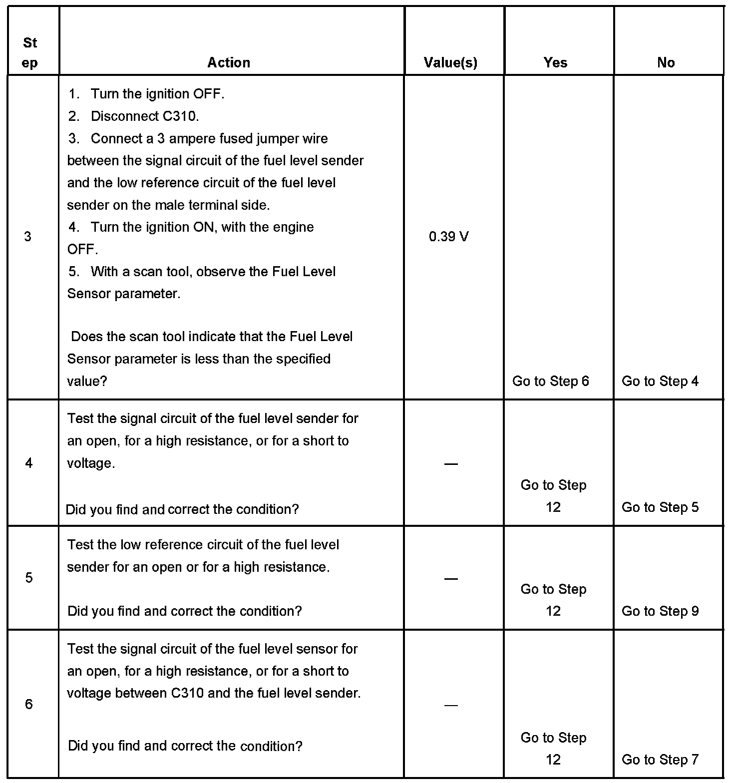 The fuel level sender changes resistance in response to fuel level. The PCM monitors the signal circuit of the fuel level sender in order to determine the fuel level. When the fuel tank is full, the sender resistance is high and the PCM senses a high signal voltage. When the fuel tank is empty, the sender resistance is low and the PCM senses a low signal voltage. The PCM uses the signal circuit of the fuel level sender in order to calculate the percentage of fuel remaining in the tank. The PCM sends the fuel level percent via the class 2 serial data circuit to the instrument cluster in order to control the fuel gage. The fuel level information is also used for misfire and EVAP diagnostics.