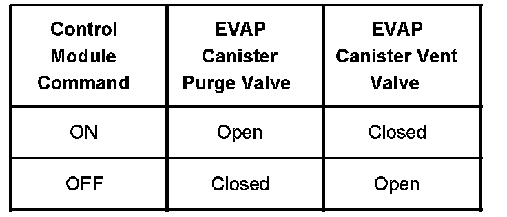 The table illustrates the relationship between the ON and OFF states, and the Open or Closed states of the EVAP canister purge and vent valves.