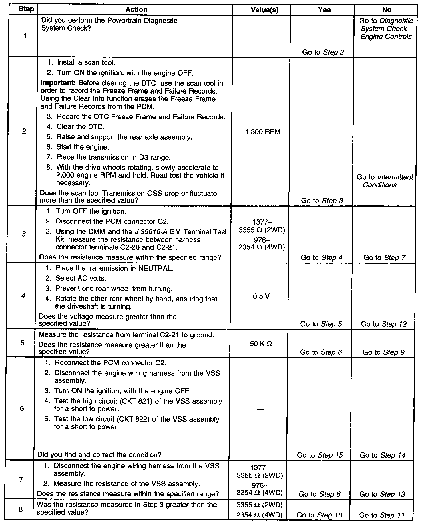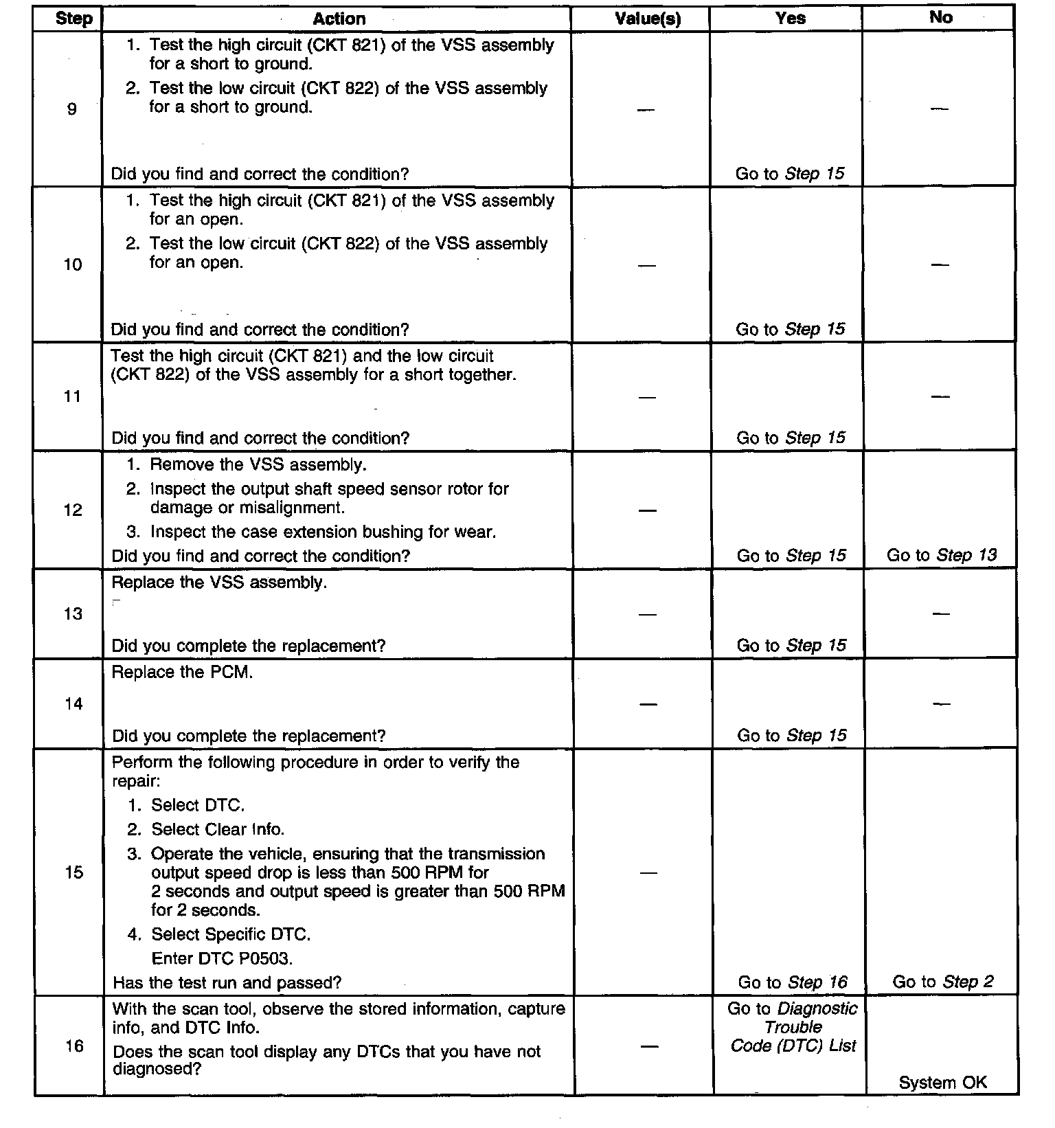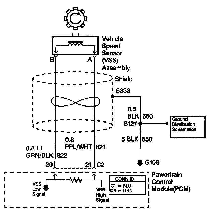 The Vehicle Speed Sensor (VSS) assembly provides vehicle speed information to the Powertrain Control Module (PCM). The VSS assembly is a permanent magnet generator. The VSS produces an AC voltage as rotor teeth on the transmission output shaft pass through the sensor's magnetic field. The AC voltage level and the number of pulses increase as the speed of the vehicle increases. The PCM converts the pulsing voltage to vehicle speed. The PCM uses the vehicle speed signal to determine shift timing and Torque Converter Clutch (TCC) scheduling. When the PCM detects an unrealistically large drop in vehicle speed, then DTC P0503 sets. DTC P0503 is a type BDTC.