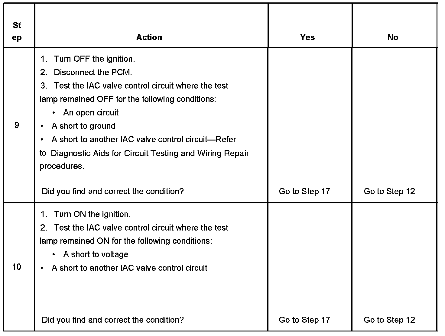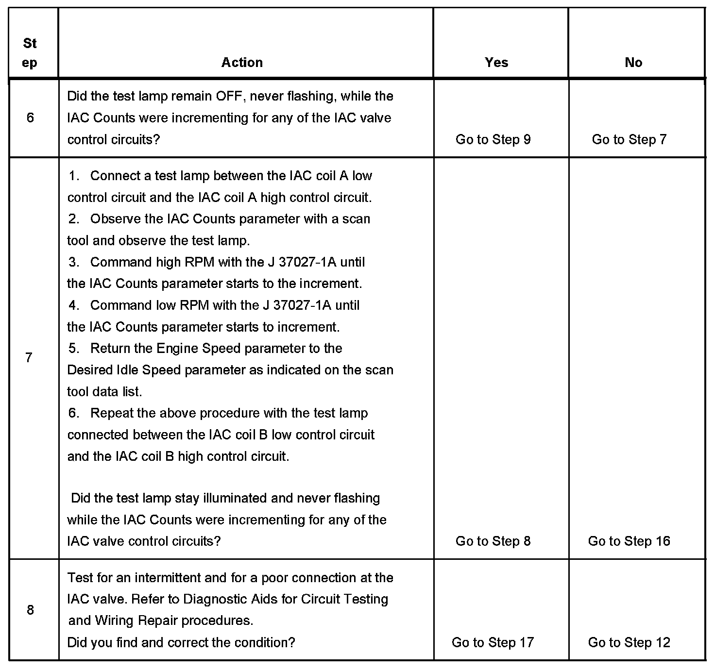 7. This test will determine the ability of the PCM to provide the IAC valve control circuits with a ground. On a normally operating system, the test lamp should not flash while the IAC Counts are incrementing.