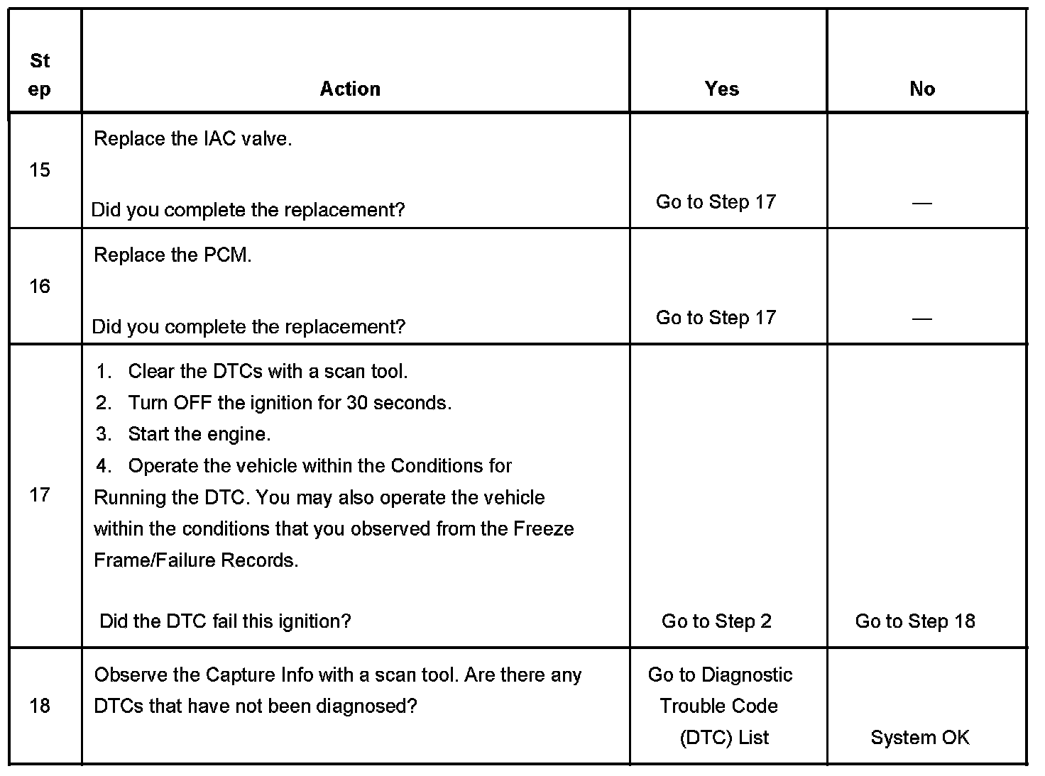CIRCUIT DESCRIPTIONThe engine idle speed is controlled by the idle air control (IAC) valve. The IAC valve is on the throttle body. The IAC valve pintle moves in and out of an idle air passage bore to control air flow around the throttle plate. The IAC valve consists of a movable pintle, driven by a gear attached to an electric motor called a stepper motor. The stepper motor is capable of highly accurate rotation, or of movement, called steps. The stepper motor has 2 separate windings that are called coils. Each coil is supplied current by two circuits from the powertrain control module (PCM). When the PCM changes polarity of a coil, the stepper motor moves one step. The PCM uses a predetermined number of counts to determine the IAC pintle position. Observe IAC counts with a scan tool. The IAC counts will increment up or down as the PCM attempts to change the IAC valve pintle position. An IAC Reset will occur when the ignition key is turned OFF.