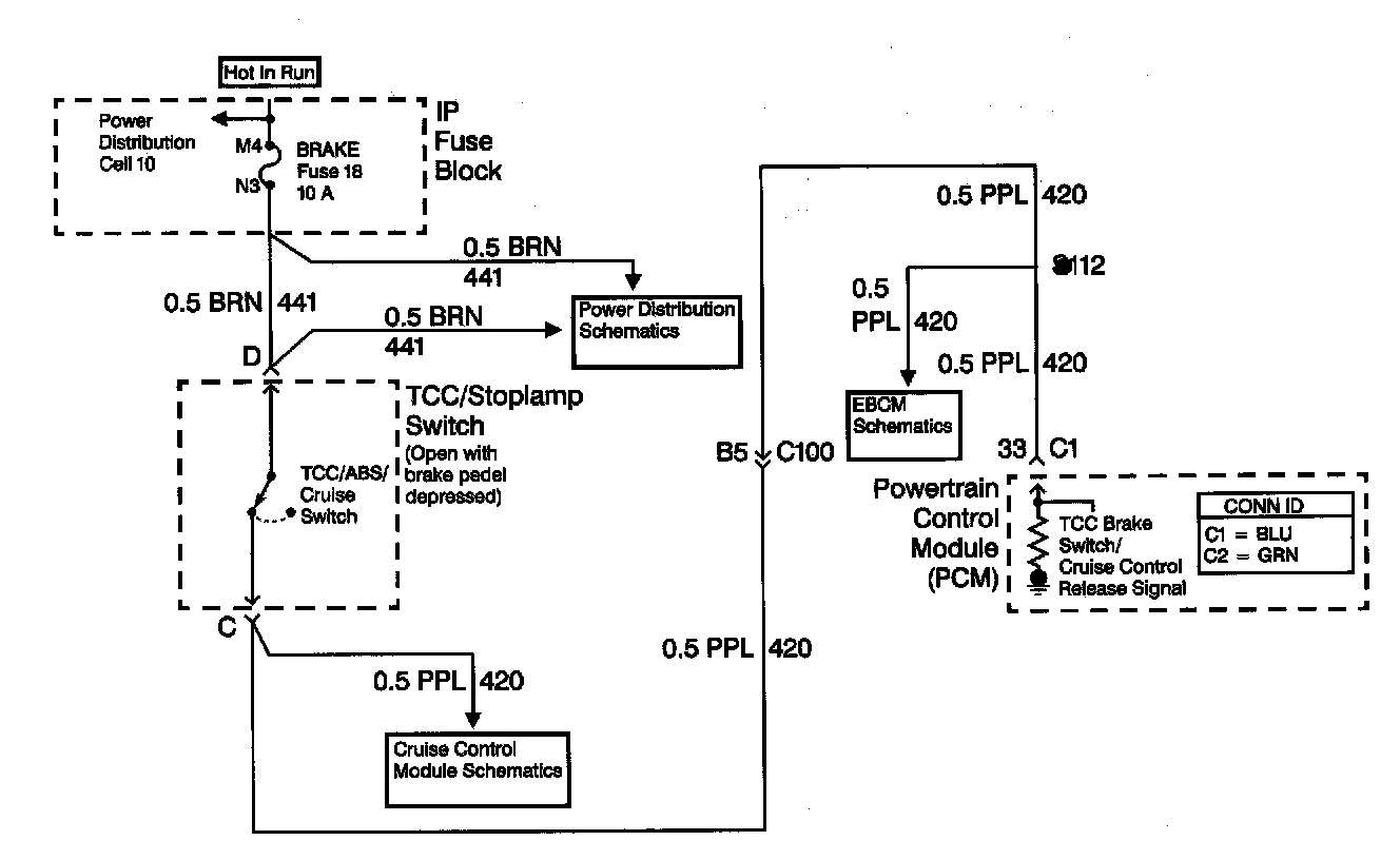The brake switch indicates brake pedal status to the Powertrain Control Module (PCM). The brake switch is a normally-closed switch that supplies battery voltage on the TCC brake switch signal circuit to the PCM. Applying the brake pedal opens the switch, interrupting voltage to the PCM. When the brake pedal is released, the PCM receives a constant voltage signal. If the PCM receives a zero voltage signal at the brake switch input, and the Torque Converter Clutch (TCC) is engaged, the PCM de-energizes the TCC solenoid valve. The PCM disregards the brake switch input for TCC scheduling if there is a brake switch circuit fault.