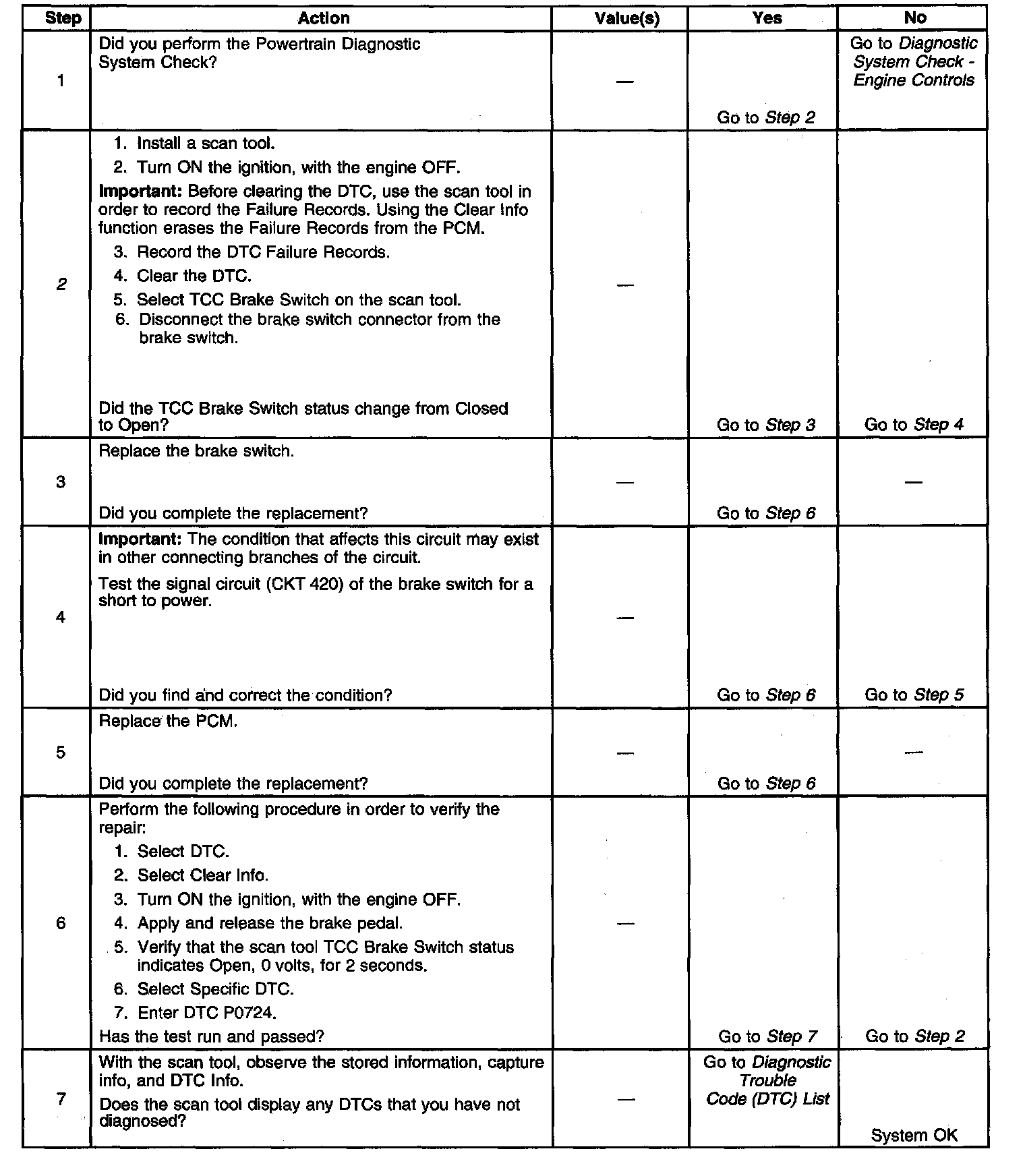 When the PCM detects a closed brake switch circuit, 12 volts, high input, during decelerations, then DTC P0724 sets. DTC P0724 is a type C DTC.