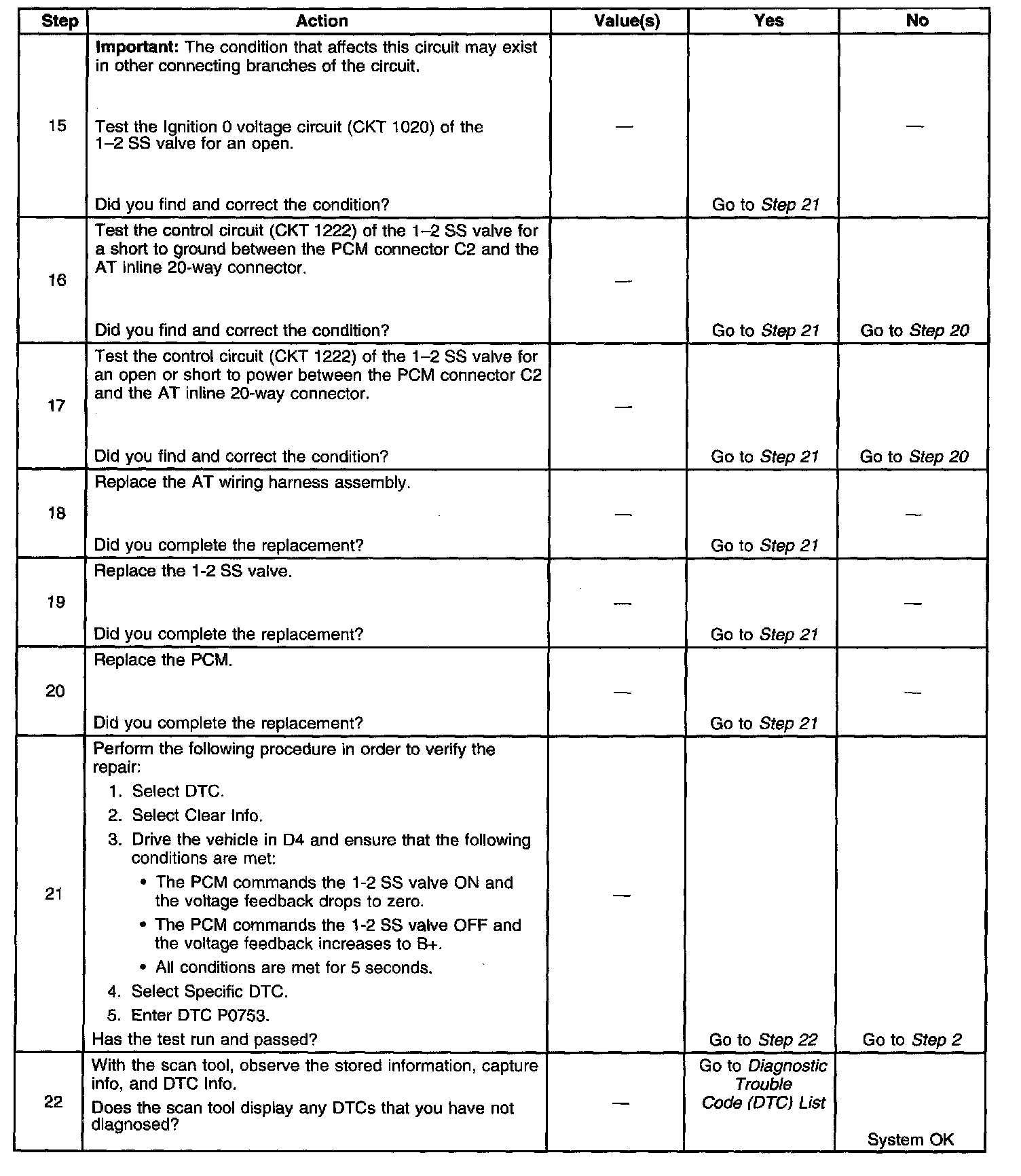 The 1-2 Shift Solenoid (SS) valve controls the fluid flow acting on the 1-2 and 3-4 shift valves. The solenoid is a normally-open exhaust valve. With the 2-3 SS valve, the 1-2 SS valve allows four different shifting combinations. The solenoid attaches to the control valve body within the transmission. The 1-2 SS valve receives ignition voltage through the Ignition 0 voltage circuit. The Powertrain Control Module (PCM) controls the solenoid by providing the ground path on the 1-2 SS valve control circuit. When the PCM detects a continuous open, short to ground or short to power in the 1-2 SS valve circuit, then DTC P0753 sets. DTC P0753 is a type B DTC.