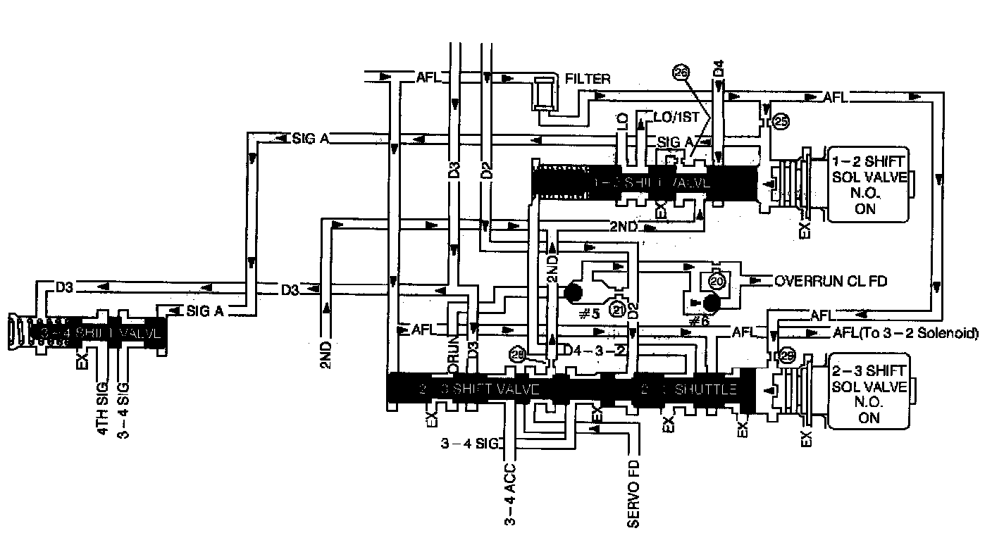The 2-3 Shift Solenoid (SS) valve controls the fluid flow acting on the 2-3 shift valves. The 2-3 SS valve is a normally-open exhaust valve that is used with the 1-2 SS valve, in order to allow four different shifting combinations.