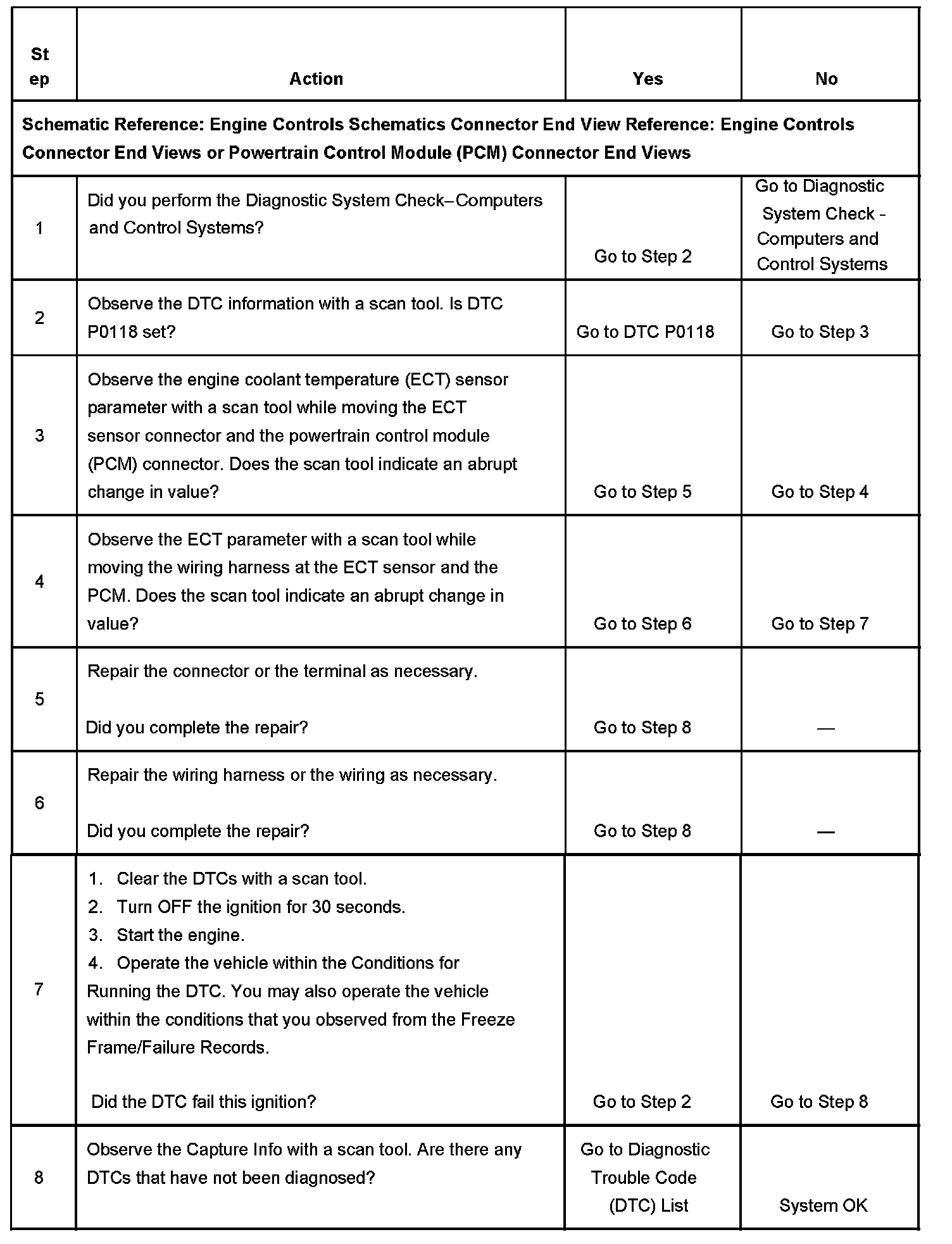 CIRCUIT DESCRIPTIONThe engine coolant temperature (ECT) sensor is a variable resistor, that measures the temperature of the engine coolant. The powertrain control module (PCM) supplies 5 volts to the ECT signal circuit and a ground for the ECT low reference circuit. When the ECT is cold, the sensor resistance is high. When the ECT increases, the sensor resistance lowers. With high sensor resistance, the PCM detects a high voltage on the ECT signal circuit. With lower sensor resistance, the PCM detects a lower voltage on the ECT signal circuit. If the PCM detects an excessively high signal voltage, which is a low temperature indication, DTC P1115 sets.
