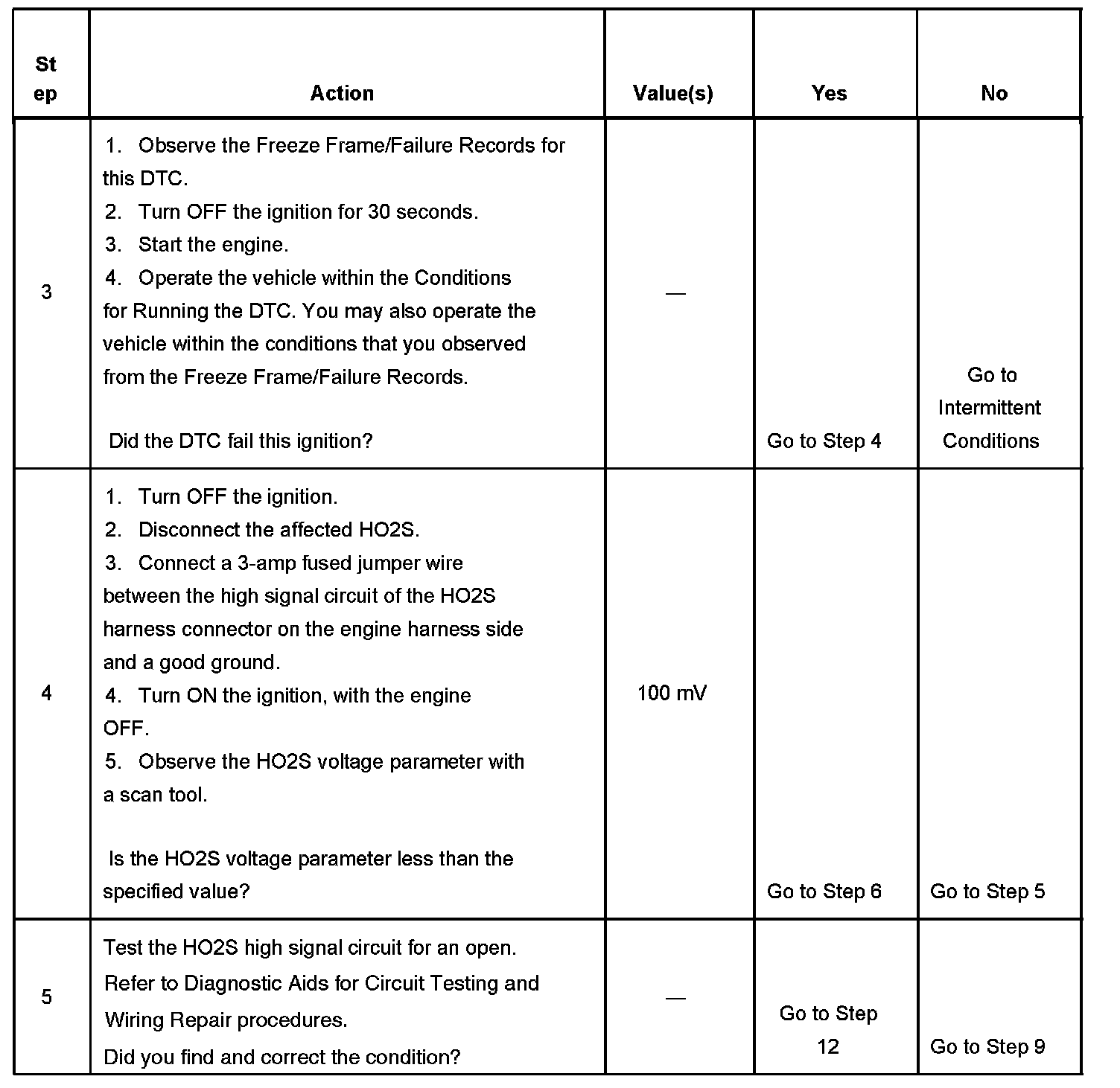 CIRCUIT DESCRIPTIONHeated oxygen sensors (HO2S) are used for fuel control and post catalyst monitoring. Each HO2S compares the oxygen content of the surrounding air with the oxygen content in the exhaust stream. The HO2S must reach operating temperature to provide an accurate voltage signal. Heating elements inside the HO2S minimize the time required for the sensors to reach operating temperature. The powertrain control module (PCM) supplies the HO2S with a reference, or bias, voltage of about 450 mV. When the engine is first started the PCM operates in open loop, ignoring the HO2S voltage signal. Once the HO2S reaches operating temperature and closed loop is achieved, the HO2S generates a voltage within a range of 0-1,000 mV that fluctuates above and below bias voltage. High HO2S voltage indicates a rich exhaust stream; low HO2S voltage indicates a lean exhaust stream. This diagnostic will only run once per ignition cycle. The PCM monitors the number of rich-to-lean and lean-to-rich transitions. A transition is defined as, the HO2S voltage changes from above 600 mV to below 200 mV or from below 200 mV to above 600 mV. If the PCM detects that the number of transitions were less than a specified value, DTC's P1133 or P1153 will set.