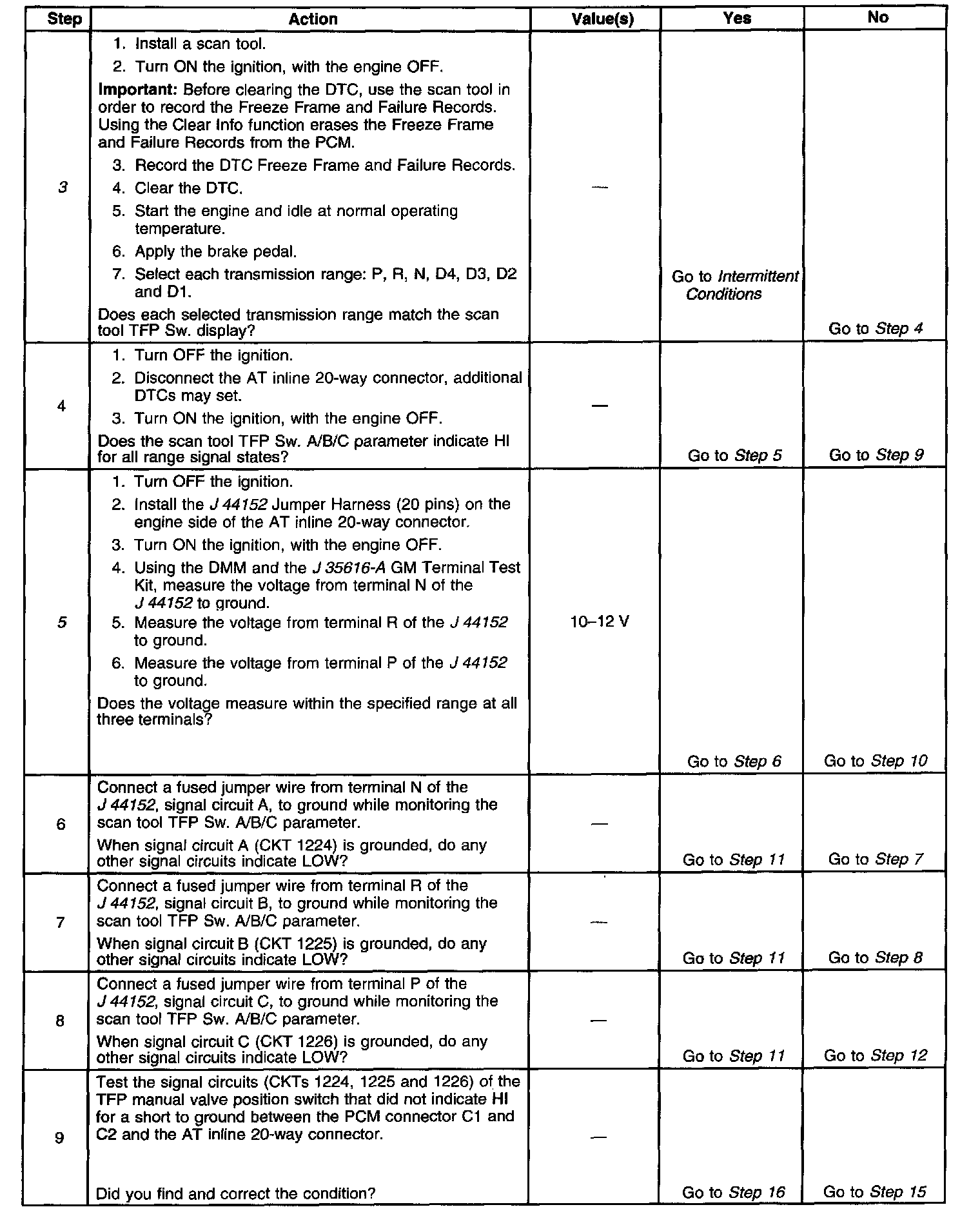^ Refer to the Transmission Fluid Pressure (TFP) Manual Valve Position Switch Logic table for the normal range signals and the invalid combinations. On the table, LOW is 0 volts, HI is ignition voltage.