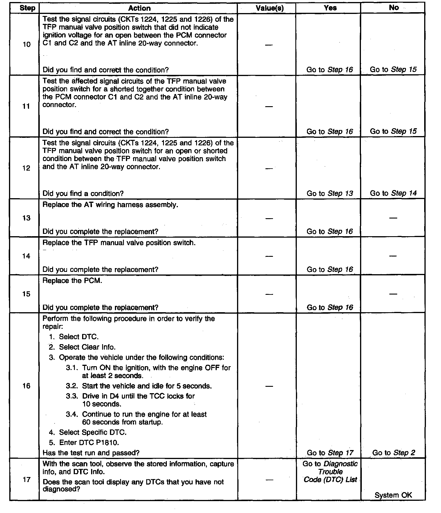 When the PCM detects an invalid state of the TFP manual valve position switch circuit by deciphering the TFP manual valve position switch inputs, then DTC P1810 sets. DTC P1810 is a type B DTC.