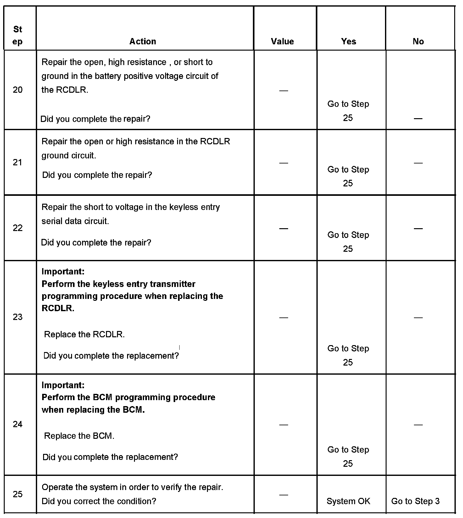 16. An illuminated test lamp at step 16 reveals a short to voltage in the serial data circuit.