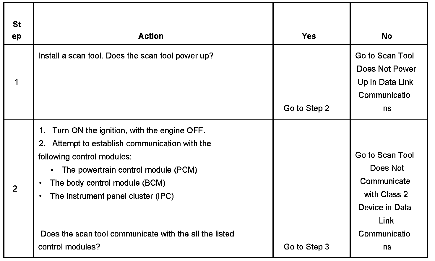2. Lack of communication may be due to a partial malfunction of the class 2 serial data circuit or due to a total malfunction of the class 2 serial data circuit.The specified procedure will determine the particular condition.