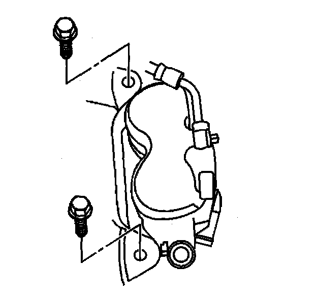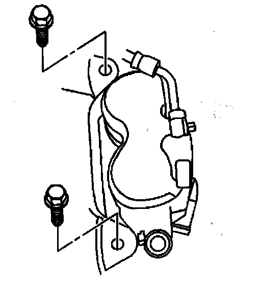 Notice: Support the brake caliper with heavy mechanic's wire, or equivalent, whenever it is separated from it's mount and the hydraulic flexible brake hose is still connected. Failure to support the caliper in this manner will cause the flexible brake hose to bear the weight of the caliper, which may cause damage to the brake hose and in turn may cause a brake fluid leak.