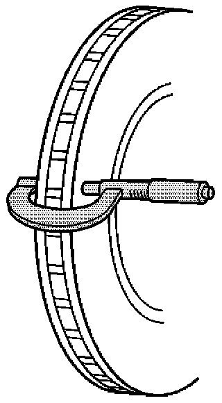 3. Using a micrometer calibrated in thousandths-of-a-millimeter, or ten-thousandths-of-an-inch, measure and record the thickness of the brake rotor at four or more points, evenly spaced around the rotor.