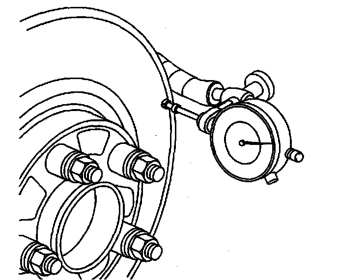 10. Mount a dial indicator, J45101, or equivalent, to the steering knuckle and position the indicator button so it contacts the brake rotor friction surface at a 90 degree angle, approximately 13 mm (0.5 inch) from the outer edge of the rotor.