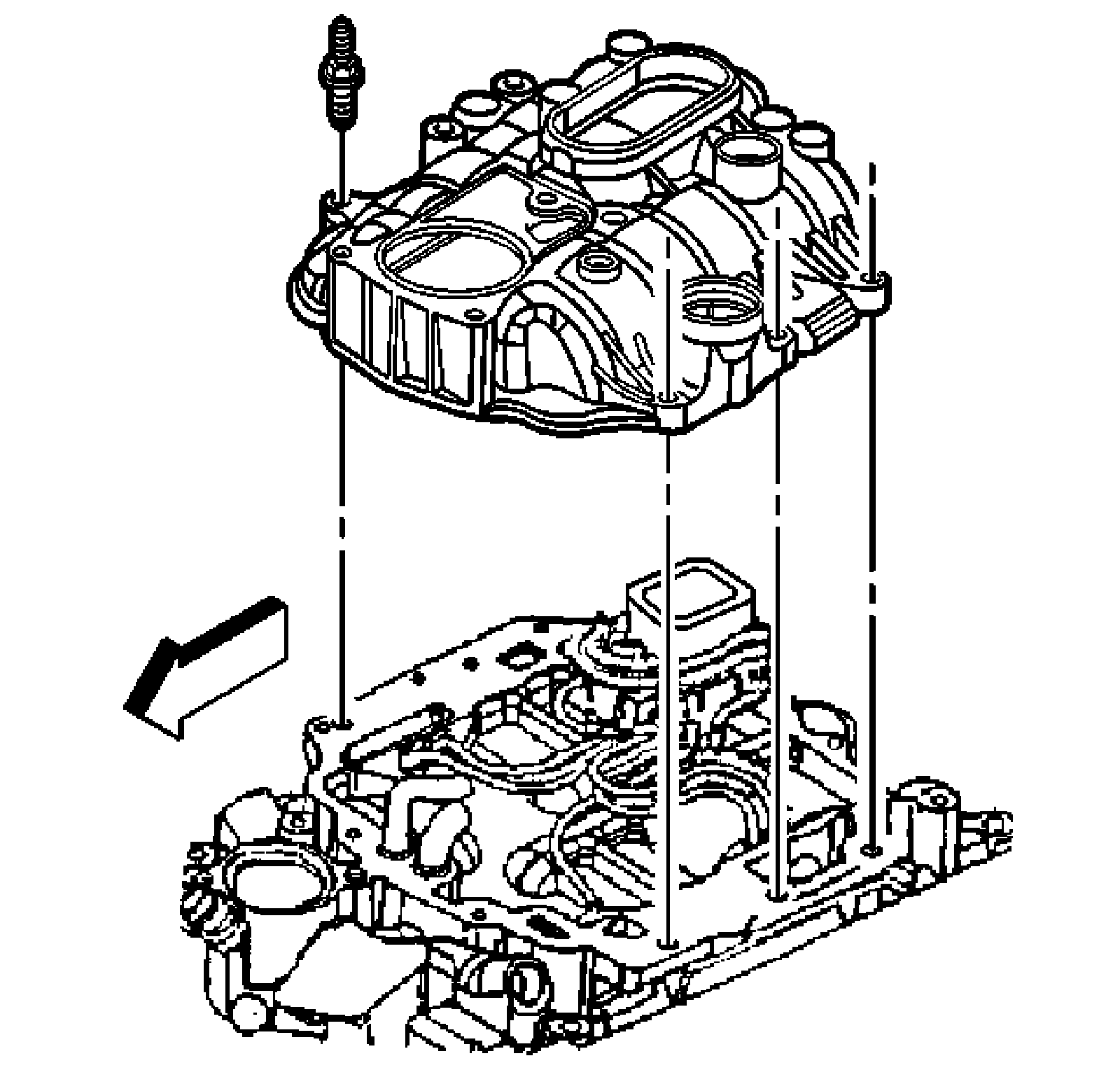 9. If reusing the fasteners, apply threadlock GM P/N 1234582 (Canadian P/N 10953489) or equivalent, to the threads of the upper intake manifold attaching studs.