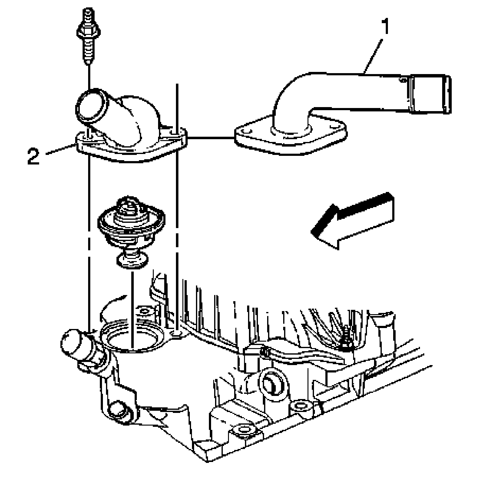 34. If reusing the engine coolant temperature (ECT) sensor plug (1) or the ECT sensor (2), if equipped, apply sealant GM P/N 12346004 (Canadian P/N 10953480) or equivalent, to the threads of the ECT sensor plug (1) or the ECT sensor (2).