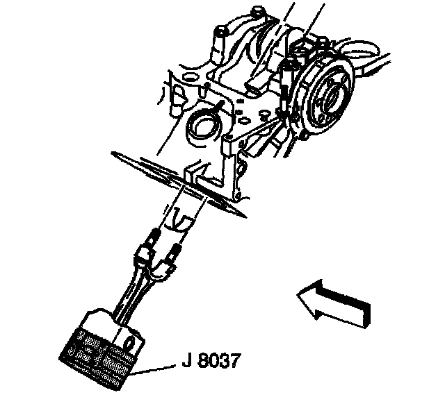 4. Install the piston and connecting rod assembly, and the J 8037 into the proper cylinder bore.