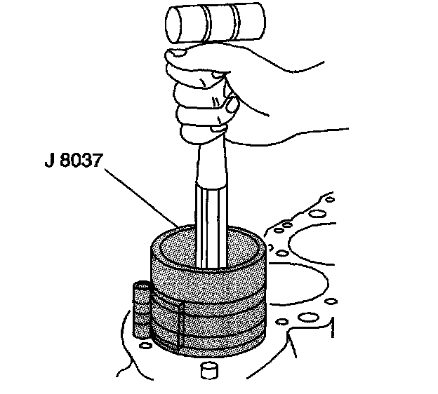 5. Use the J 8037 and the J 5239 and lightly tap the top of the piston with a wooden hammer handle.