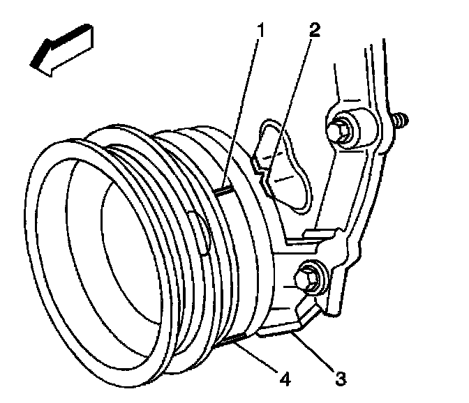 5. Rotate the crankshaft balancer to position the crankshaft balancer alignment mark (1) 57-63 degrees clockwise or counterclockwise from the engine front cover alignment tab (2).