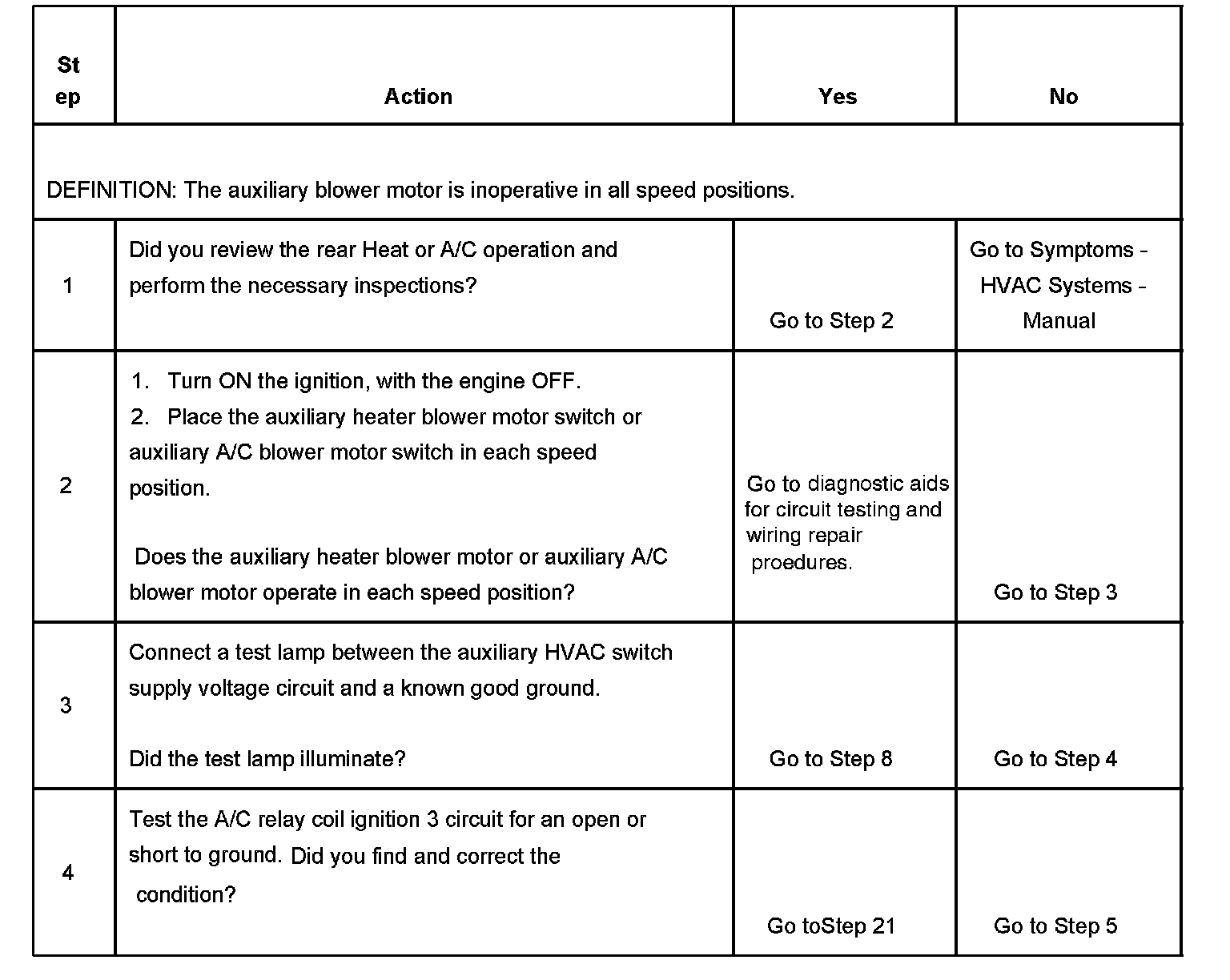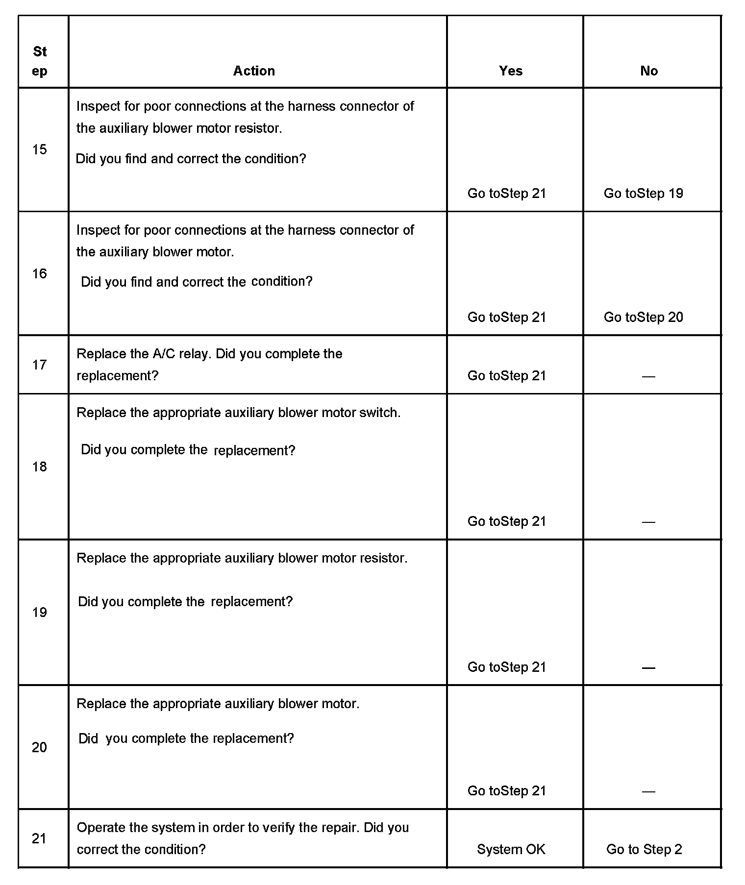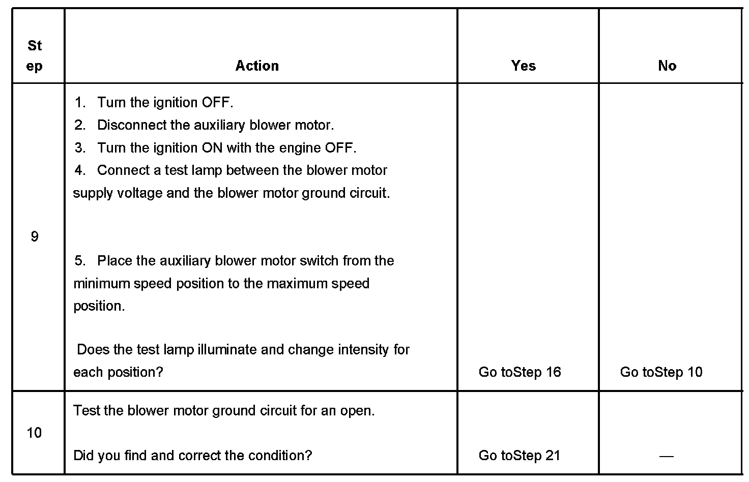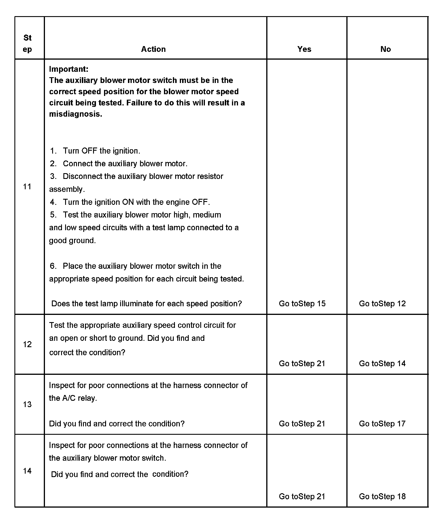 2. This step tests for auxiliary heater and A/C blower motor operation in any speed setting.