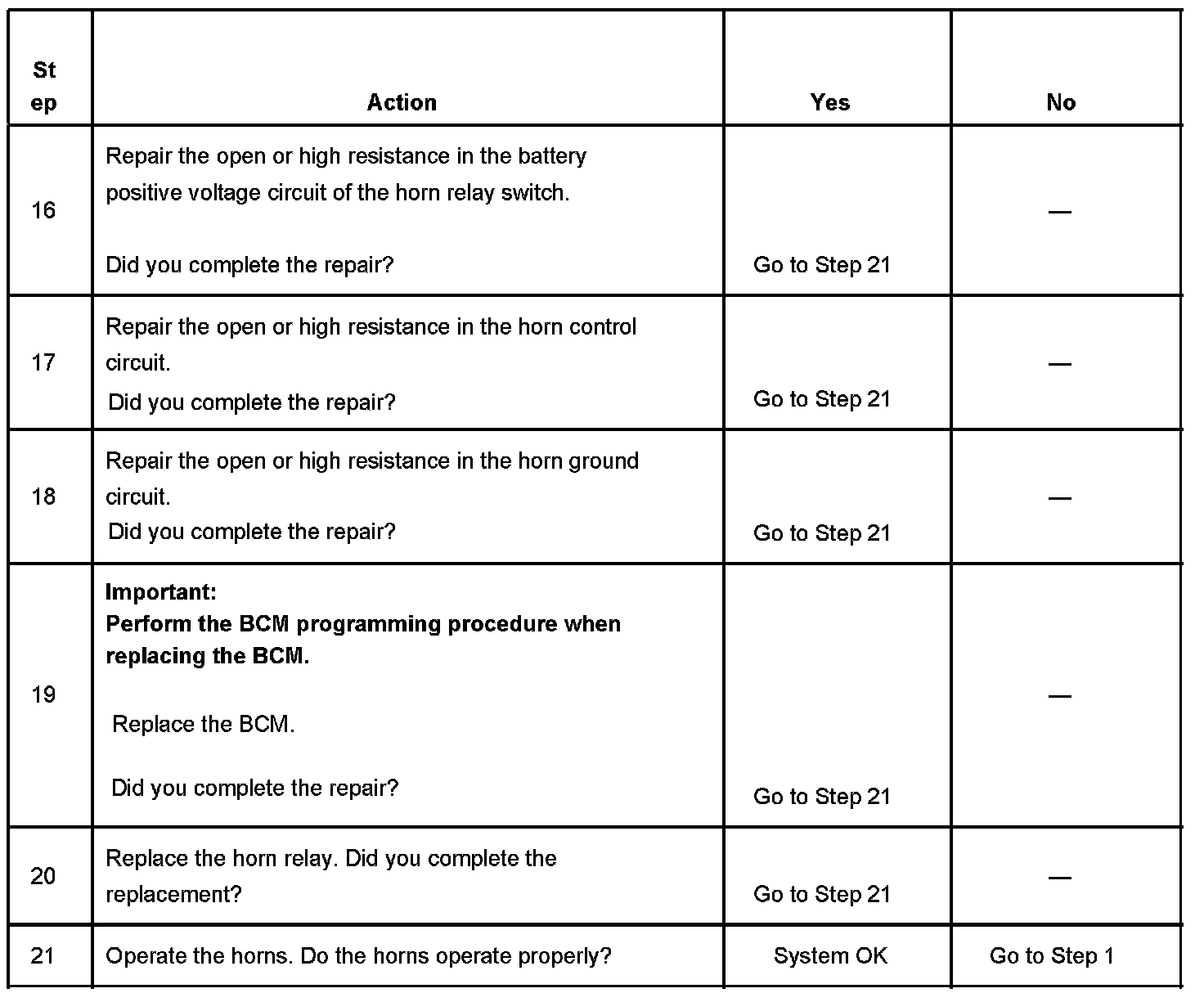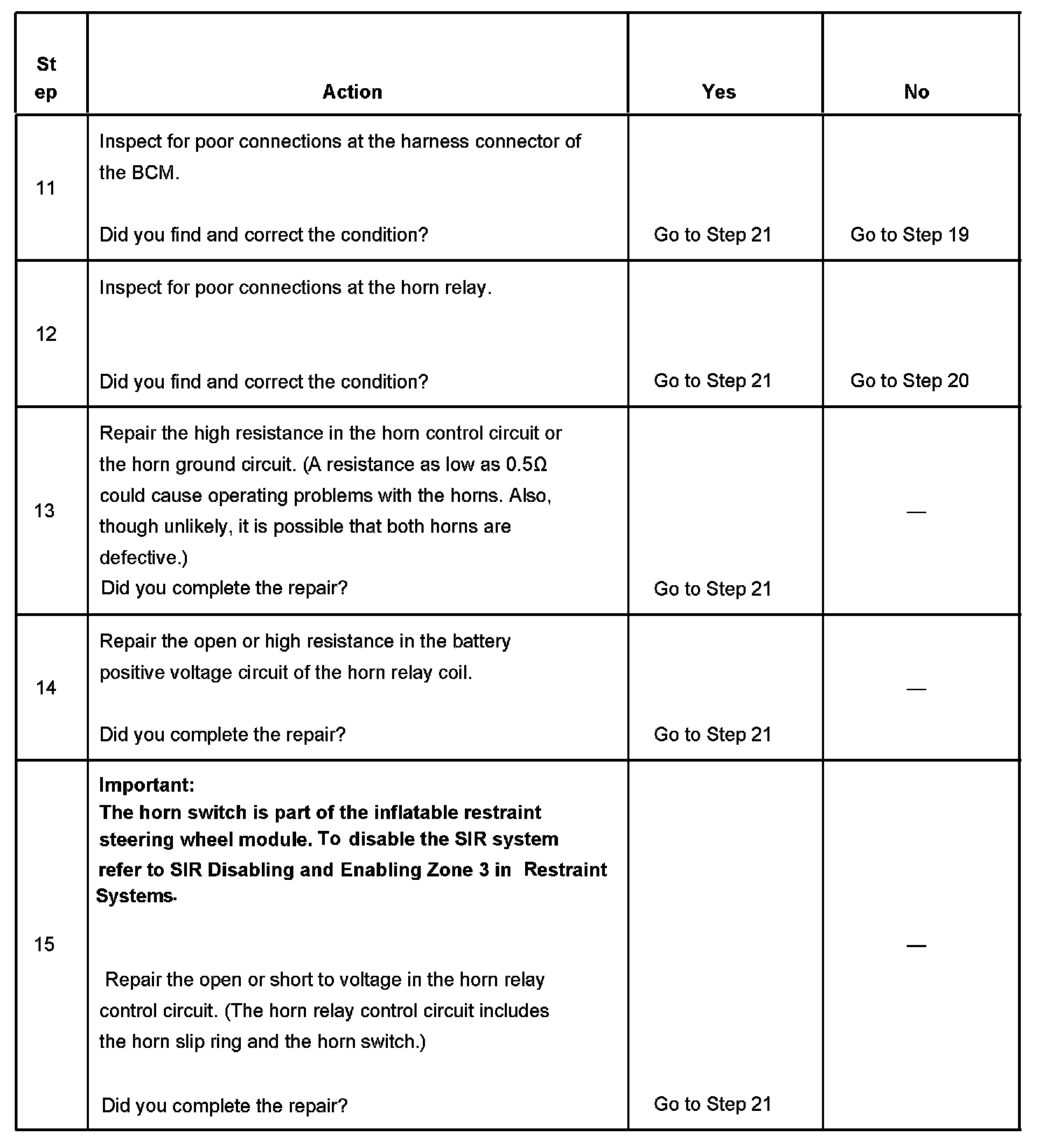 15. The horn relay control circuit includes the horn slip ring and the horn switch. The horn slip ring and the horn switch must be tested for a high resistance,an open or a short to voltage when testing the relay control circuit.