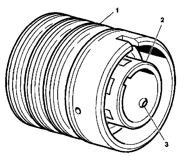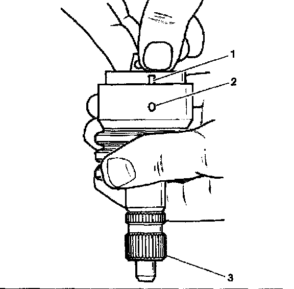 2. Simultaneously push and rotate the valve spool (2) into the valve body (1) until the hole (3) in the valve spool (2) for the stub shaft pin is accessible from the opposite end of the valve body (1).