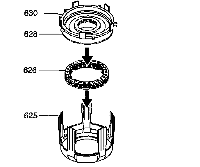 Important: The forward clutch piston (630) apply legs must be indexed with the 3rd and 4th clutch apply ring (625) legs.