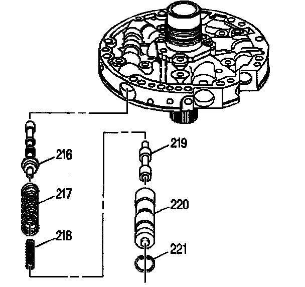 3. Remove the pressure regulator isolator spring (218) and the pressure regulator valve spring (217).